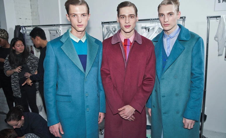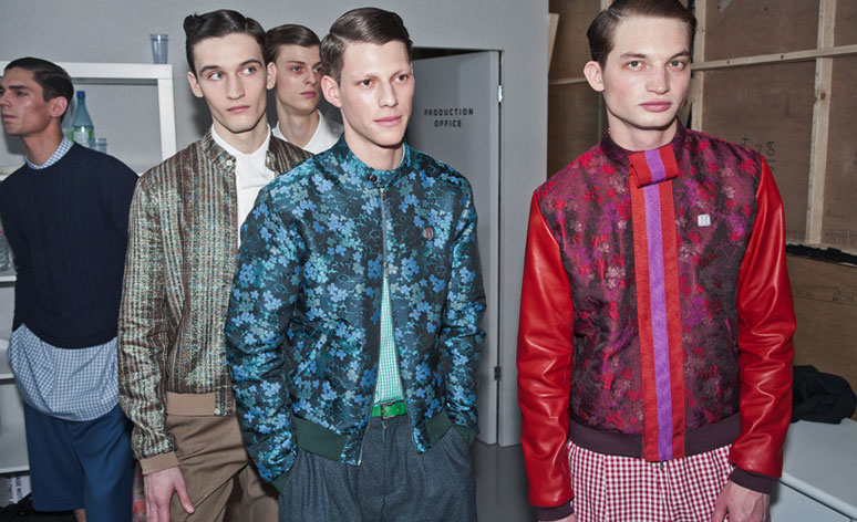 Closing the first day of London Collections: Men, Richard Nicoll's latest outing showcased a punchy, opulent bravado - moving away from many of the subdued street and workwear tones that have left his previous showings somewhat monotone. Departing from a vivid cerulean parka topped with mink, the A/W 2014 collection held a steely duality in the smart mix of flat and shine (or dare I say bold and boring) that comprised each look, be it a metallic bomber over flannel trousers or a stencilled sweater spelling 'brutal' worn with baggy shorts and trailing chequered shirt tails. A folded collar detail in flat grosgrain ribbon was a precursor to further experimentation - a New Wave-inspired series of tucked and pleated formal shirts cut in pastel silk gazar closed the show with a jolt of acid evening fun.