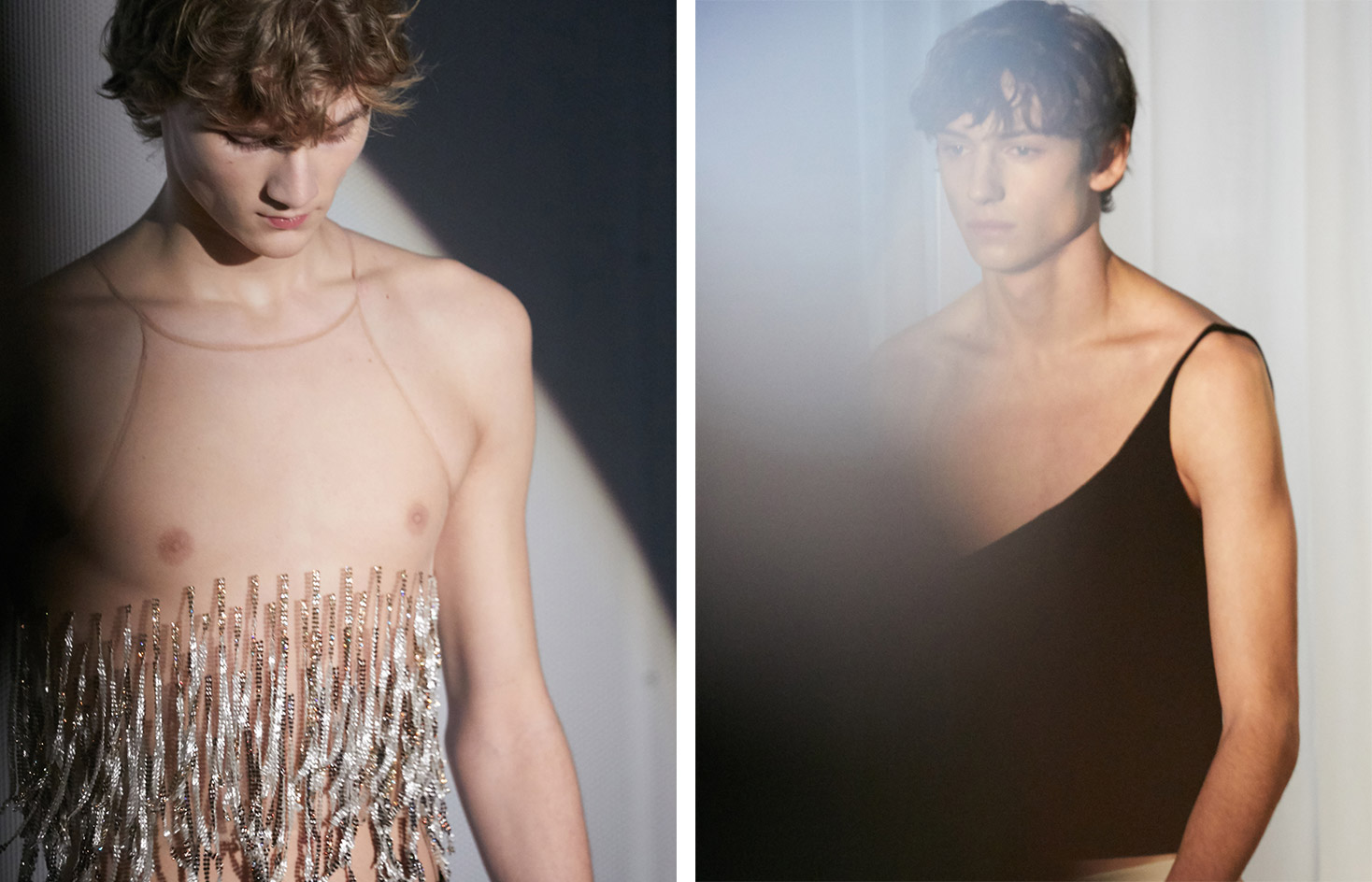 Best in show: A dégradé of crystals was embroidered onto a nude, sheer tank. Trousers were ruched, shearling was strict and minimal in buttery caramel, which stroked bare shoulders. A white knit had a dramatic oval cutaway: it was as if the spotlight had burned a hole to reveal the chest. In reference to Yves Saint Laurent’s 1969 collaboration with the artist couple François-Xavier and Claude Lalanne, Sernin cast parts of the male body and reproduced them in ceramic. They were wrapped around high-waist trousers. Or left to dangle around the neck. §