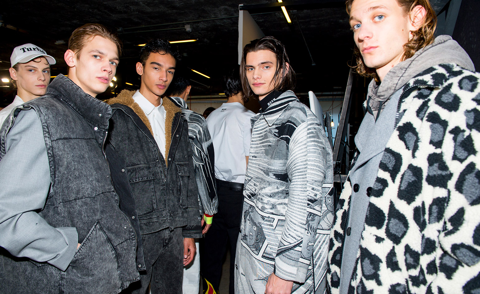 Sound bite: Motor racing culture met with an Italian post-punk line. Cotton jackets had allover flame prints. Washed denim cargo pants were cut wide influenced by pit crew uniforms. Motorsport newspaper stories were printed onto striped shirts and a smart camel coat. ‘MSGM is evolving. Speed has always been at our heart, the fast passion of life. What do we do as we grow? We go faster,’ Giorgetti said. Backstage the mood board included close ups of car headlights, black and white photographs of cars in motion and energetic scenes from 1980s Japanese football cartoon Holly & Benji. These appeared as a jacquard on a half-zip pullover and a classic trench.