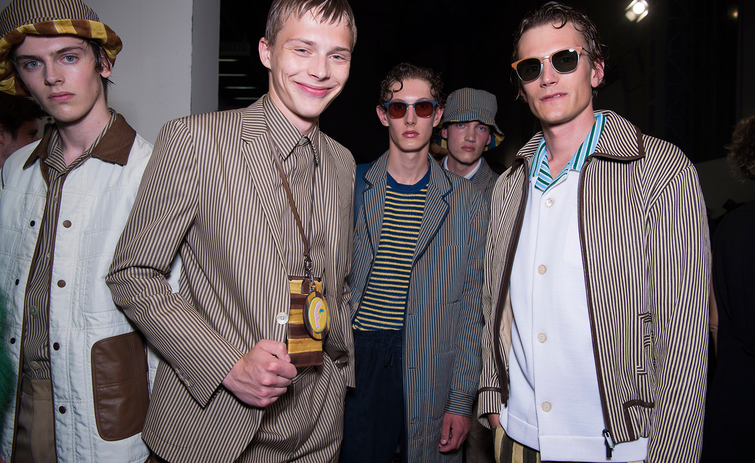 Mood board: Fendi’s men were as cool and crisp as the bright blue pool of water they strolled around in the brand’s Milan headquarters. With plenty of patchworked terry cloth, micro houndstooth and fluttering printed silk, this loose, loungey leisurewear covered high-end bathrobes to boardroom suits and everything in between.