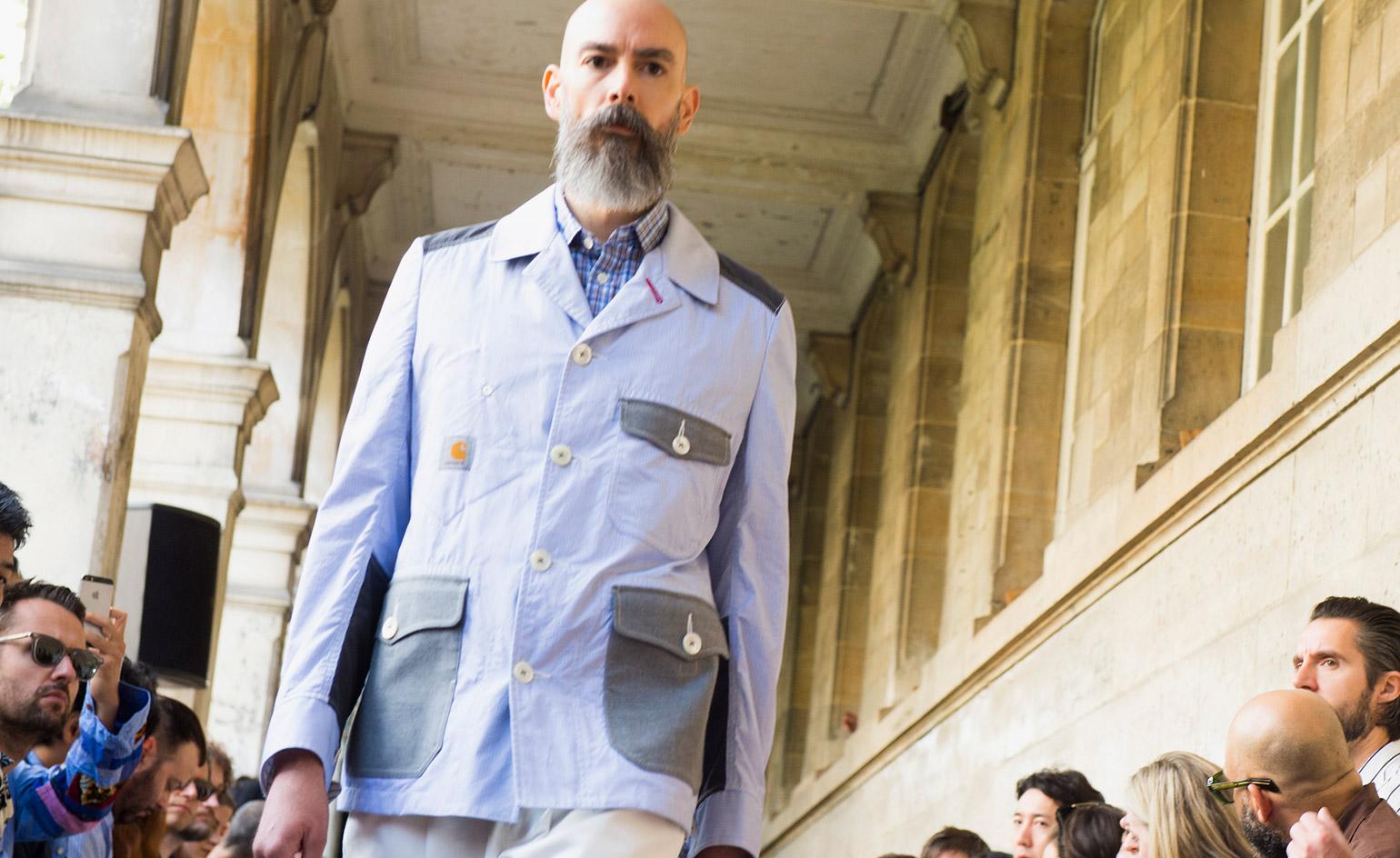 Team work: We are used to seeing collaborations launched for the Instagram hits alone. Be it musicians recording songs or social media influencers moonlighting as models, it is the lifeblood of so many. Watanabe, however, has been working with the brands he loves for decades. S/S 2018 featured a number of partnerships with British brands including Turnbull & Asser for shirting; outdoor outfitters Karrimor for coats; and printmaker and typographic artist Alan Kitching, whose graphics could be seen on T-shirts. Longstanding partners Levi’s and Carhartt were also here – their utilitarian DNA was refreshed with new fabrication and cut. Forty-eight original styles from Carharrt were created in Watanabe’s choice of fabric and the proportion of Levis was dropped, their pockets elongated.
