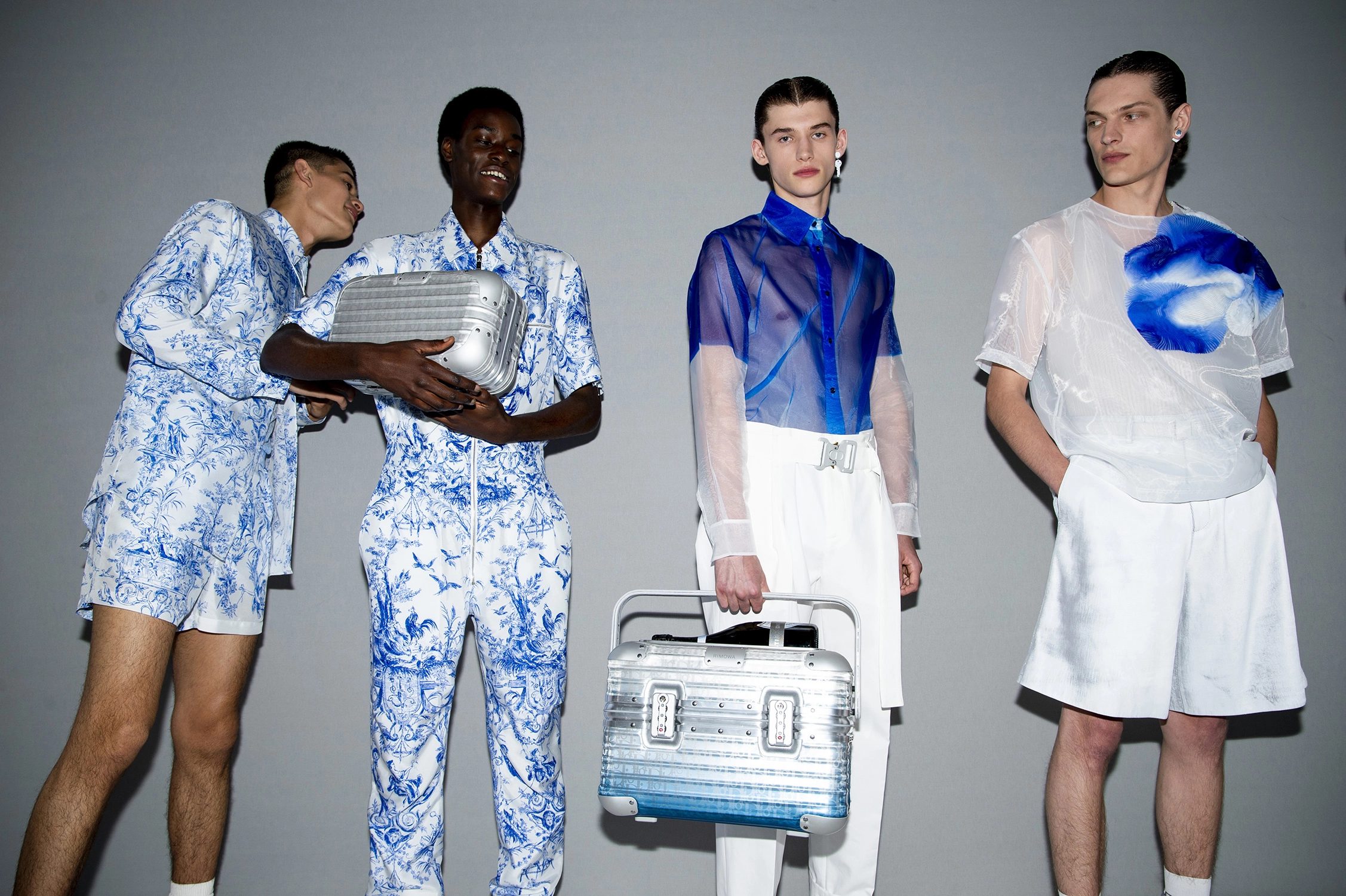 Team work: Models carried aluminium backpacks, hand cases and suitcases produced in partnership with eminent German luggage brand RIMOWA. The Dior oblique motif is inscribed onto the aluminium casing. A picnic case had a nook for a bottle of champagne. Elsewhere, in a nod to the brand’s history, Arsham has redesigned Galliano’s iconic newspaper print first introduced in the S/S 00 Haute Couture collection, and recast, eroded and remade Yoon Ahn’s jewellery designs as long-buried, modern relics.
