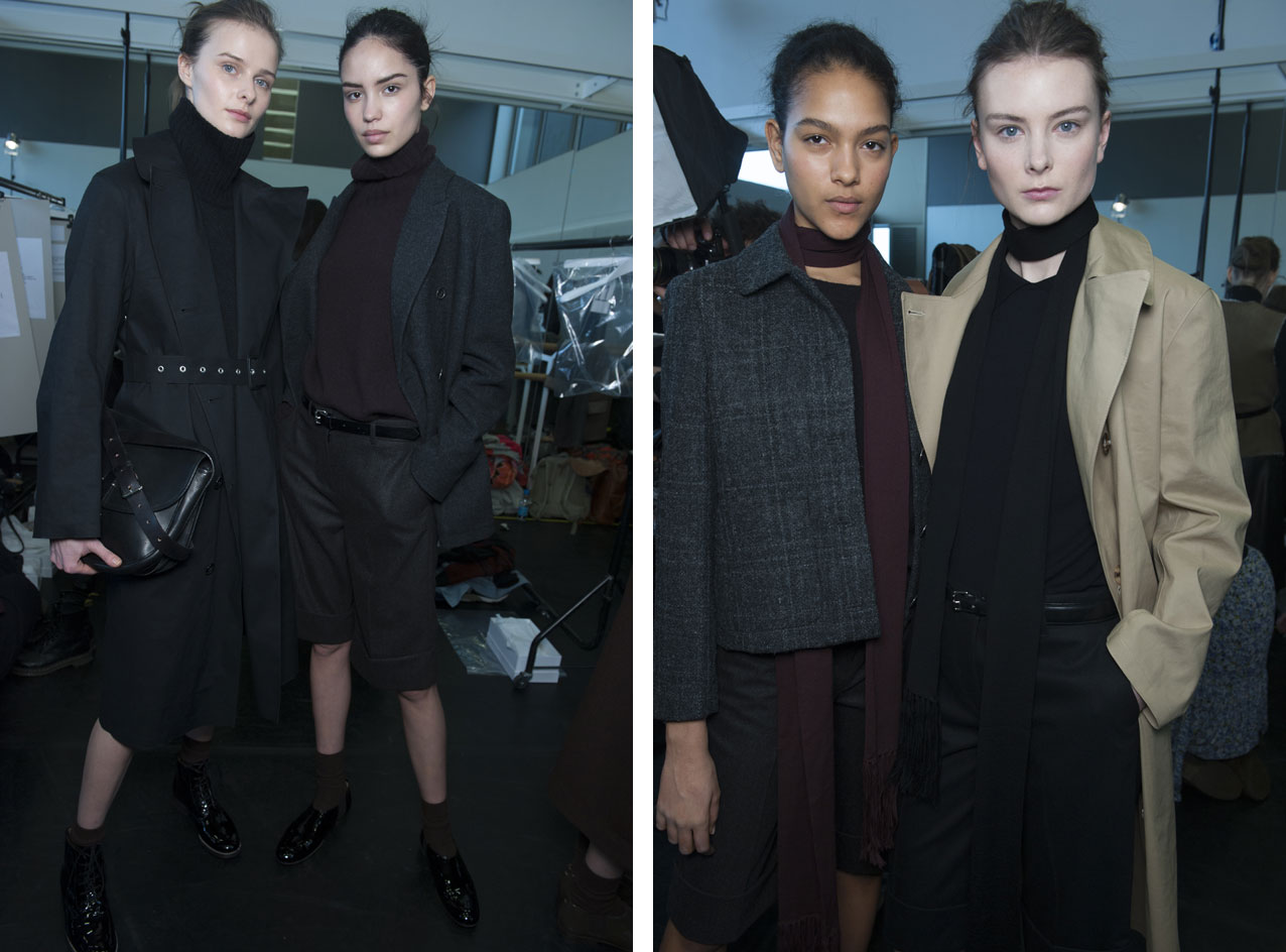 Mood board: Tone-on-tone fine wool and tweed silhouettes in whites, greys, khakis and burgundy, combined with low cut patent leather Chelsea boots worn with socks. A calm and composed collection, where androgynous models strolled leisurely past in wide legged slouchy pants and mid-calf length wrap skirts, leather skirts and shearling vests, all images of practicality and warmth.