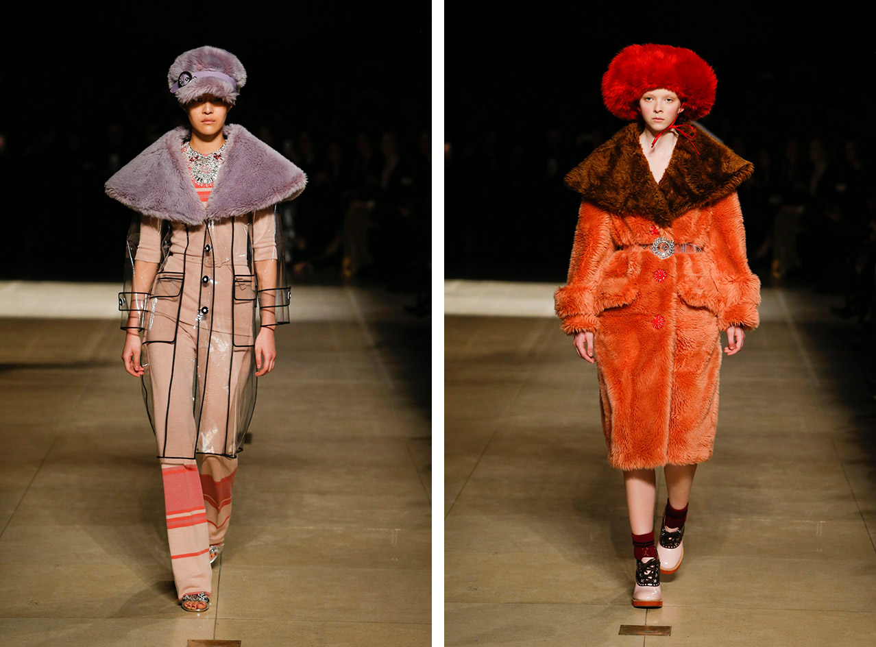 Scene setting: For A/W 2017, Miuccia Prada covered the interior of the Palais d’Iéna with a fluffy layer of purple fake fur. This thicket of dense fur lined every visible surface, from the grand staircases and balustrades, to the walls and the double rows of seating, acting as an antidote to the grand architectural design of the space, which was built in 1937 by Auguste Perret. A row of huge mirrors lined the walls, and as the show began, they reverberated with the pounding sound of a televised French game show, mixed with De La Soul’s Magic Number.