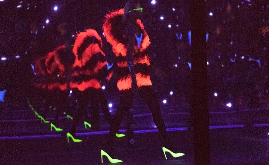Scene setting: For A/W 2019, Saint Laurent erected a huge silver box wrapped in mirror panelling, directly opposite the Eiffel Tower in Paris’ historic Place du Trocadero. As guests climbed the staircase into the space, the Eiffel Tower was reflected in a graphic, distorted image across the façade’s reflective panes. On arrival, guests sat on tiered seating running the length of one wall. As the show began, a mirror, behind the catwalk, and facing the audience, vanished to reveal lengths of vertically lined lightbulbs, which frenetically pulsated and twinkled throughout.