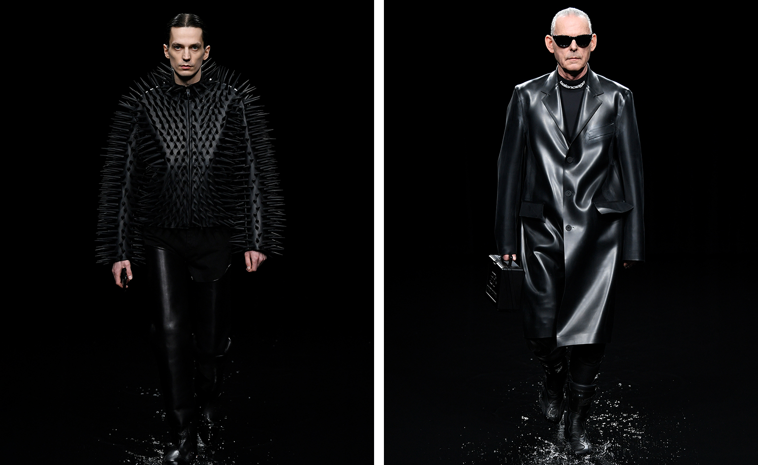 Mood board: Gvaslia explained this was his most personal collection yet – he’d spent hours pouring over his sewing machine during his research process. Rendered largely in black, the offering has a monastic, clerical air – long smocks in black velvet, habit-like hooded coats, sacramental jackets – amalgamated with peak shouldered tailoring, motorcross uniforms, and even a series of neon ‘BL’ logo football strips. The monochromatic focus was also a nod to Cristóbal Balenciaga, who was famously obsessed with the hue.