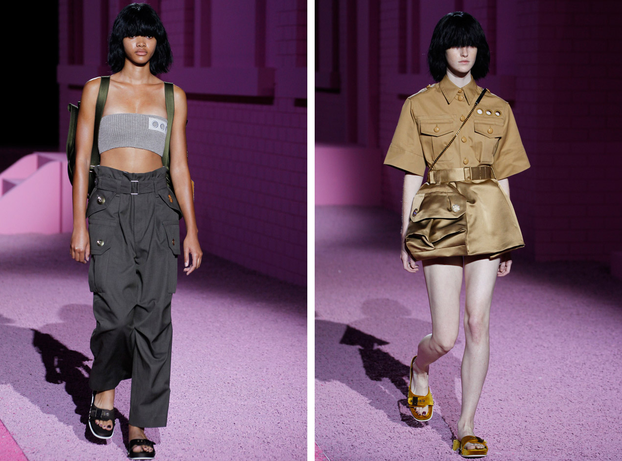 Now that Marc Jacobs has untethered himself from Louis Vuitton, the American designer is pouring his efforts purely into his own fashion label. The increased intensity could be felt upon stepping foot into the show space, where a towering pink house had been constructed with a shaggy rug in matching shades of bubblegum and lavender. There was something norm-core about the design-less home - as well as the disembodied voice that spoke to each guest through individual Dr Dre headsets placed at each seat - and to some extent this simplicity was carried over to the clothes. That isn’t a criticism; in fact, Jacobs worked and re-worked his theme (which largely centred on fatigues) in so many guises, the utilitarian garments took on a completely new, artistic life. But the base shapes were simple and straightforward: tunic dresses, culottes, army coat dresses cut like kaftans, and belted strapless dresses. Jacobs’ creativity shone through in the way he treated each look, blowing up cargo pockets on the side of dresses, for instance, and punching the seams with large plastic studs. The mood was cool and the details were original – especially the pony skin and velvet Dr Scholl sandals and the uniformly styled black bobs that obliterated the individuality of his models. What felt most familiar, however, were the handbags, which came in all manner of shapes and sizes. Now that’s one trick he took from his past gig in Paris that is going to make the tills ring loudly back home in New York.