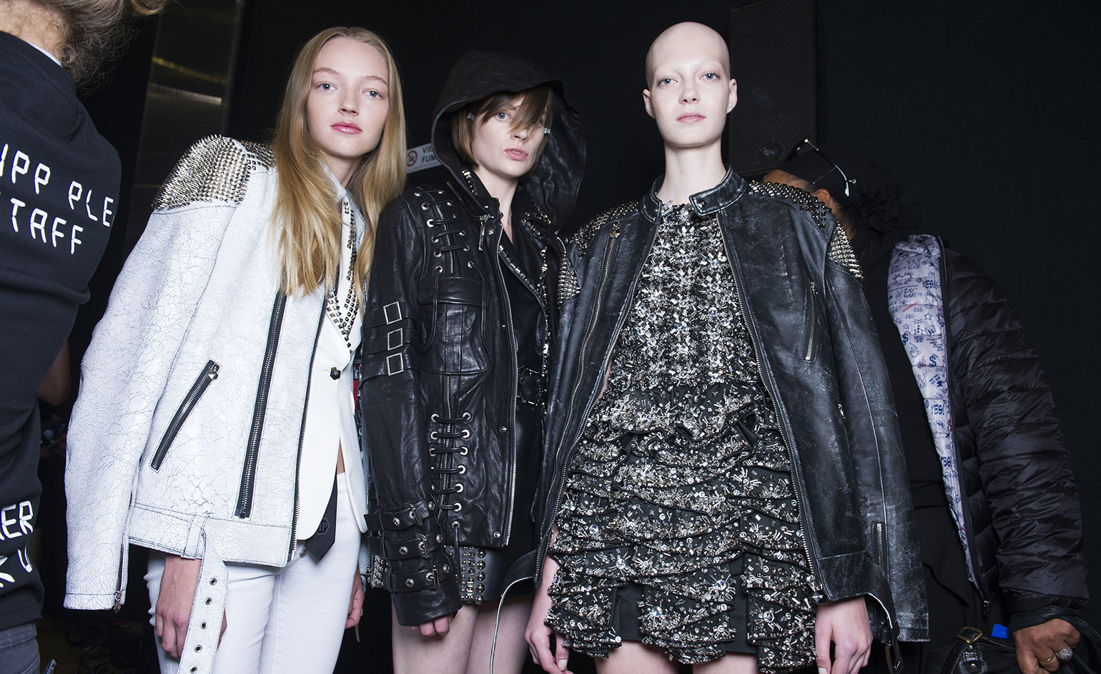 Mood board: It was a high tech punk heaven as Philipp Plein delivered his latest blockbuster show in Milan that set man against machine – or, to be more precise, robot against woman. Plein’s woman is a fierce, fearless one who is a warrior on the streets as well as the nightclubs – she’s thrown out her high heels for spiked flat boots and studded up platforms and she’s got enough leather and silver to fill up a band of high-end Harley’s Angels.