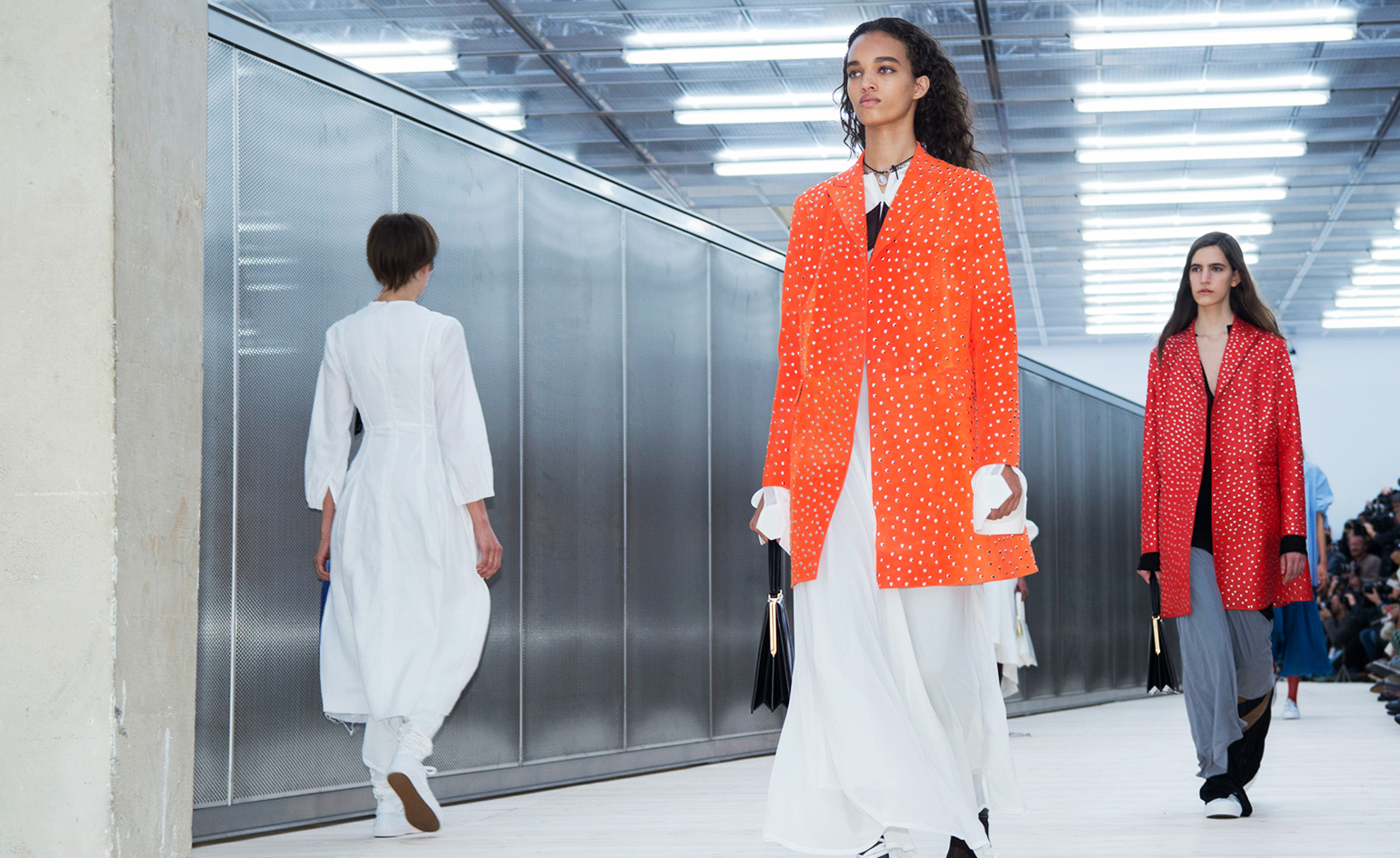 Mood board: Phoebe Philo planted a duet of large sinuous glass pavilions in the centre of the Céline runway by way of artist Dan Graham, the first indication that the clothes this season were going to curve and caress the body. She kept her palette rigorous, working with a base of sharp black-and-white and occasionally adding an exuberant pop of mandarin or tomato red on boxy, studded coats. And even though the linebacker-style shoulders spoke to a rigid 80s moment, her collection fluttered from chiffon-trimmed ankles to dresses with trailing scarves.