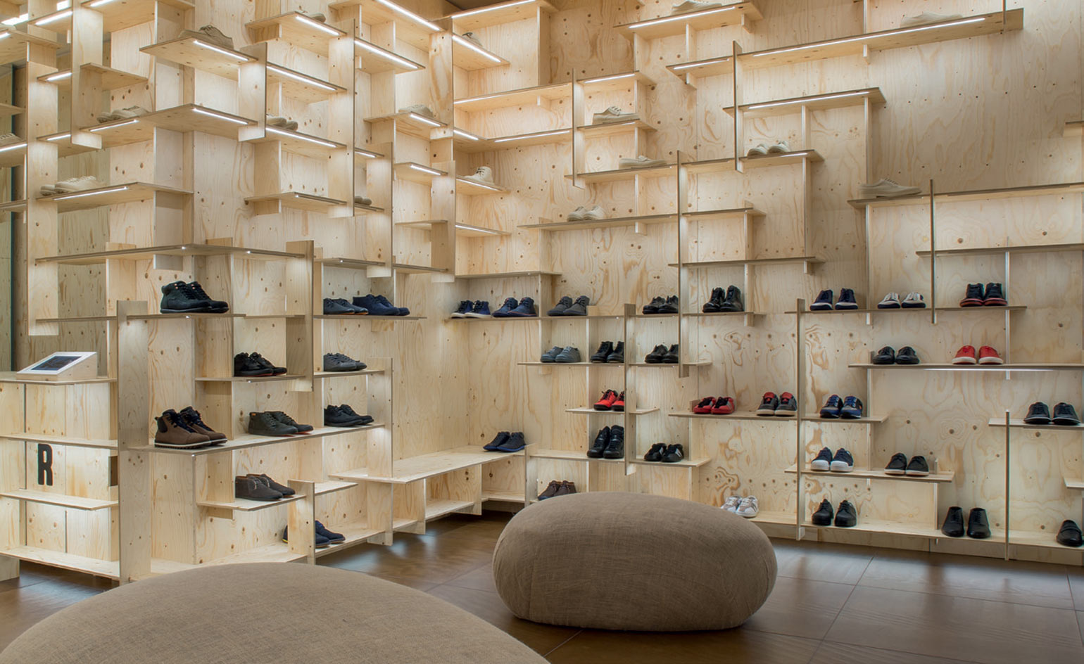 In Melbourne, Marko Brajovic’s shop is dominated by thousands of red shoelaces hung from the ceiling, while Nendo’s Madrid space features rows of white trainers fixed to its walls. By contrast, Kengo Kuma’s Milan boutique is composed of a simple plywood assembly system, which hides a very sophisticated lighting network inside. ‘We worked with Mario Nanni of Viabizzuno,’ says Kuma. ‘I was astonished when I learned that the wiring for the lighting could be set in the thin plywood.’ The co-existing duality of basic and complex eloquently depicts Camper’s attitude to design. ‘They don’t hesitate,’ says Nendo’s Oki Sato.