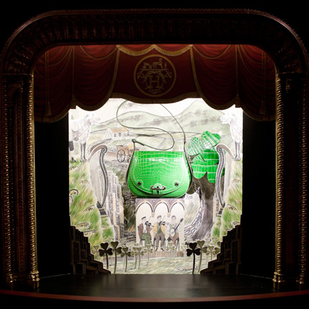 A viewing station, equipped with glittering silver opera binoculars, taunts the viewer's line of vision towards a giant neon Kelly bag filled with different variations of the brand’s iconic bags through the years