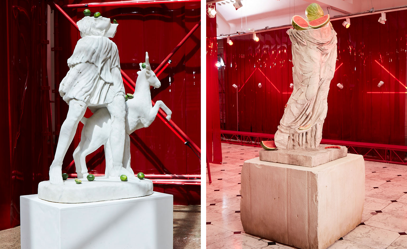 A footless Roman warrior lies broken on the ground, sprinkled with berries and a split mango; a concrete bust of a woman is draped in satsumas. The location is the Maison Margiela atelier at 163 rue Saint-Maur, where a group of four Greco-inspired concrete and marble sculptures by the American artist Tony Matelli have been installed for the occasion of John Galliano’s debut Artisanal men’s show for the house.