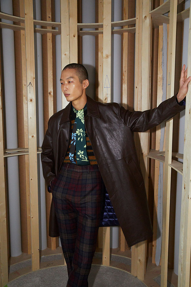 Unable to visit museums or exhibitions, Smith thought back to the subcultures that have passed him by over the last half decade of his career. His A/W 2021 collection moves through mod, skin head and punk and nods to Northern Soul, featuring an array of relaxed and refined silhouettes, from sharp four button suits in tartan flannel to ankle skimming trousers, painterly floral print overcoats to striped knitwear. Smith thought back to Northern Soul obsessives, who after a night dancing came to his Nottingham store the next morning, testing out the movability of floral Hawaiian print shirts by doing backflips. ‘I used to import boxes of Hawaiian shirts from America,' he says. ‘Usually 20 were good and 30 went straight in the bin.' The other references he drew on? Sharp double-breasted blazers or a ‘posh person's jacket,' paisley print denim jeans and jackets inspired by 'uniform dressing for a night out' and the louche lockdown wardrobe of someone popping from home to the shops - silk pyjamas with a merlot pea coat popped on top.