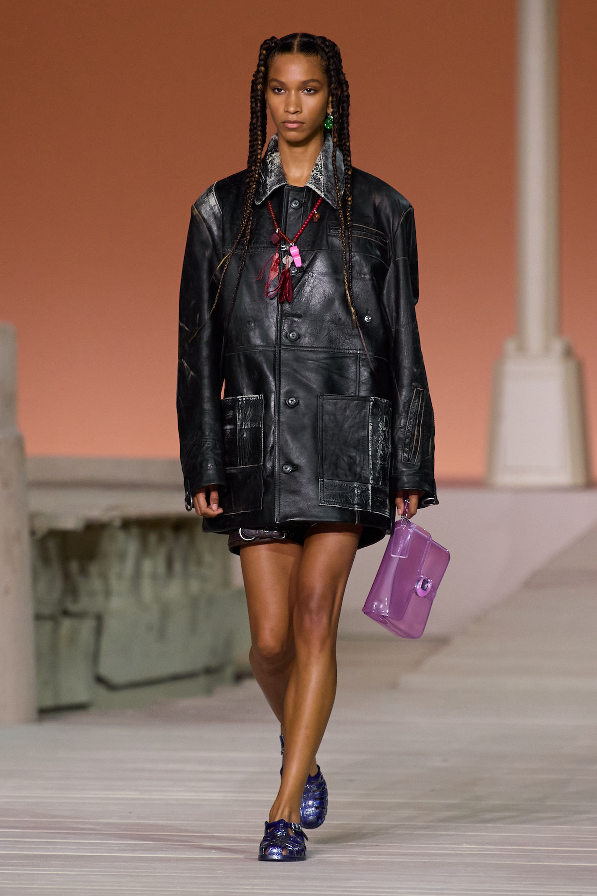 Coach is certainly steering headfirst into a new dawn for the brand. Looking to overhaul its ‘accessible luxury’ positioning and transform into a true luxury player, it's been quietly tightening distribution and upping its prices, reintroducing updated versions of bags rather than phasing styles out after a couple of seasons. All of this dovetails with a creative shifting of gears. Stuart Vevers played subversively with American codes: baby-doll prairie dresses with white socks and patent Mary Janes, varsity sweaters styled with buckled leather shorts, Fair Isle sweaters naively over-knitted with colourful yarns. Outerwear was also given serious attention – oversized leather coats had a pre-loved softness – while jelly sandals and rubber pouches in boiled-sweet tones will likely be social media catnip.