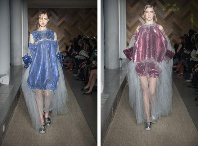 Big shapes recurred throughout the show, also in softer silhouettes like James Kelly's oversized parkas with feathery surfaces and Eva-Maria Suviste's collection, where silky fabrics on loose-cut garments became bulky through tightly woven frayed panels. Material experimentation is after all the college's calling card. Emma Hardstaff seemed to bring a coherent synthesis of the womenswear theme, crafting her own crackled metallic fabric concoction, composed of foiled fake fur and lace.