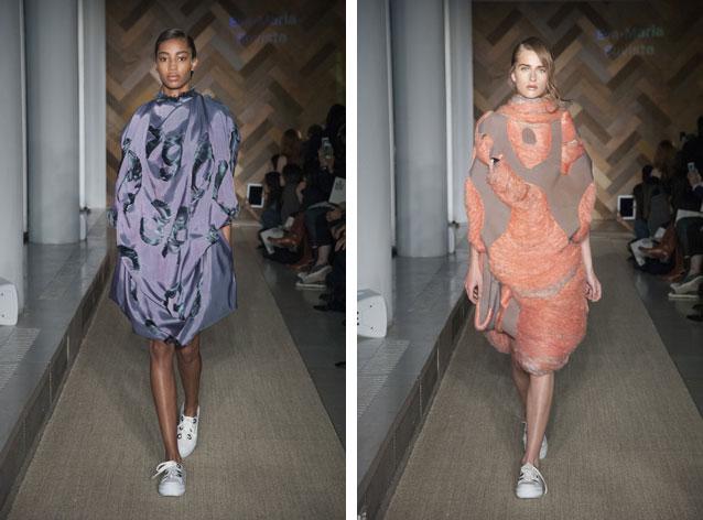 Suviste's designs work silky fabrics on loose-cut garments, which become bulky through tightly woven frayed panels