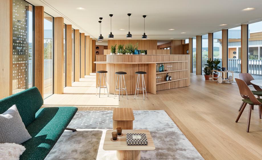 Alfredo Häberli’s case study house for Bavarian timber prefab house company Baufritz is called ‘Haussicht’ and sits on a plot near Lake Constance. Made up of two parts, the main house, and a smaller adjoining ‘Stöckli’ (a traditional type of house that Swiss farmers move into when they retire), the layout is designed to accommodate the changing needs of a family as it grows and shrinks over the course of a lifetime. From the outside, clad in vertical grey-painted timber with angled surfaces, wrapped by a sweeping terrace and topped with an overhanging sloping sheet-metal roof, the steely grey houses resemble two arks washed ashore.