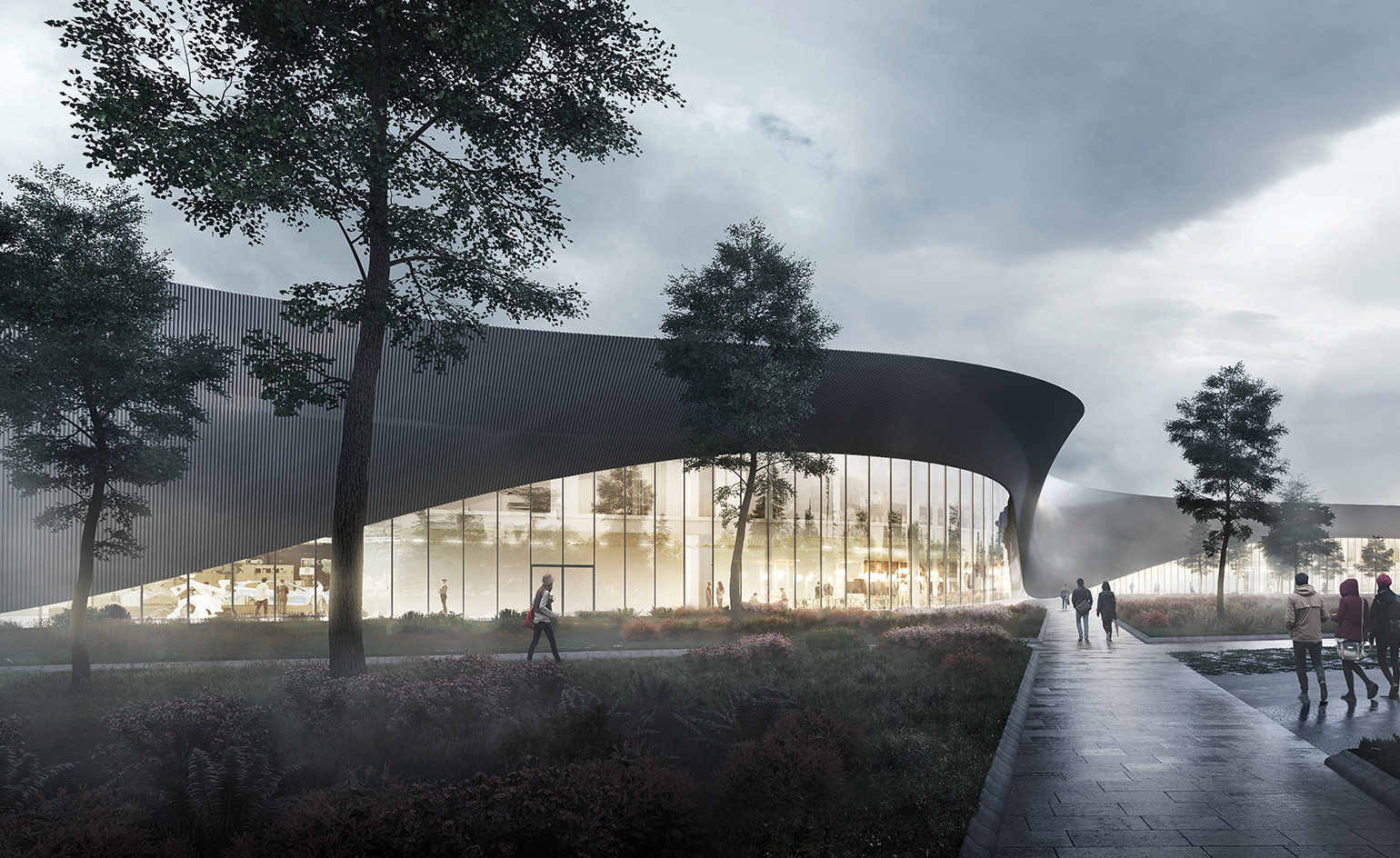 This curved creation is a production facility and visitor’s centre for Polestar, the performance brand of Volvo Cars based in Chengdu, China. Snøhetta has designed a glazed atrium that functions as a courtyard, bringing all the parts of the building together and uniting employees from different departments together. Rendering by Brick Visuals
