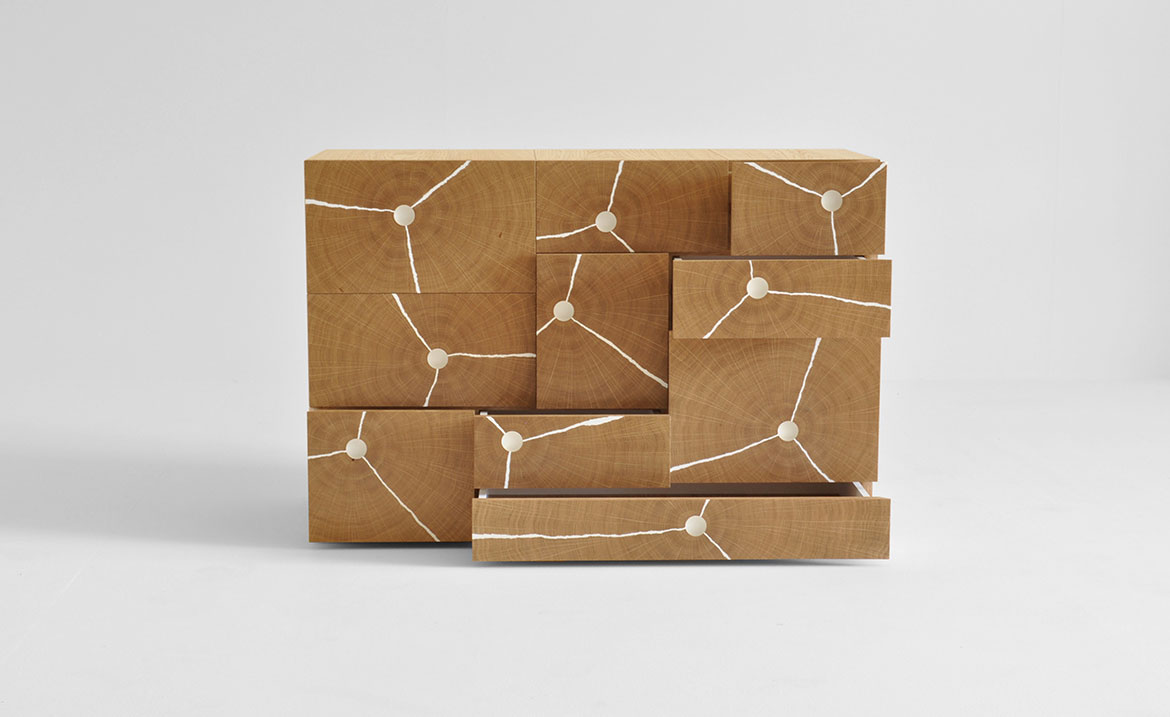 Byron’s asymmetrical piece was inspired by traditional Chinese medicine cabinets. White resin fills the fractures on the drawers panels, while a hole is cut in the central ring and used as a handle. www.byronandgomez.co.uk