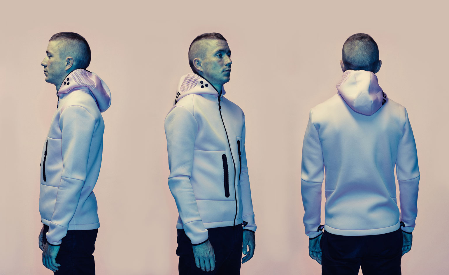 ‘The Special forces, space exploration, neuroscience, conceptual art, philosophy and material technology were all influences on product development,’ says Steve Tidball. The Condition Black jacket is designed to take almost any eventuality and keep you alive. For example, an outer surface of super-thin ceramic panels means it can survive a skid up to 120kph on any surface. The Baker Miller Pink Hoodie, with its mesh visor and asymmetrical sling pockets, is designed to ease pre-event tension and promote post-event recovery, or ‘enhance your parasympathetic nervous system,’ says Tidball.
