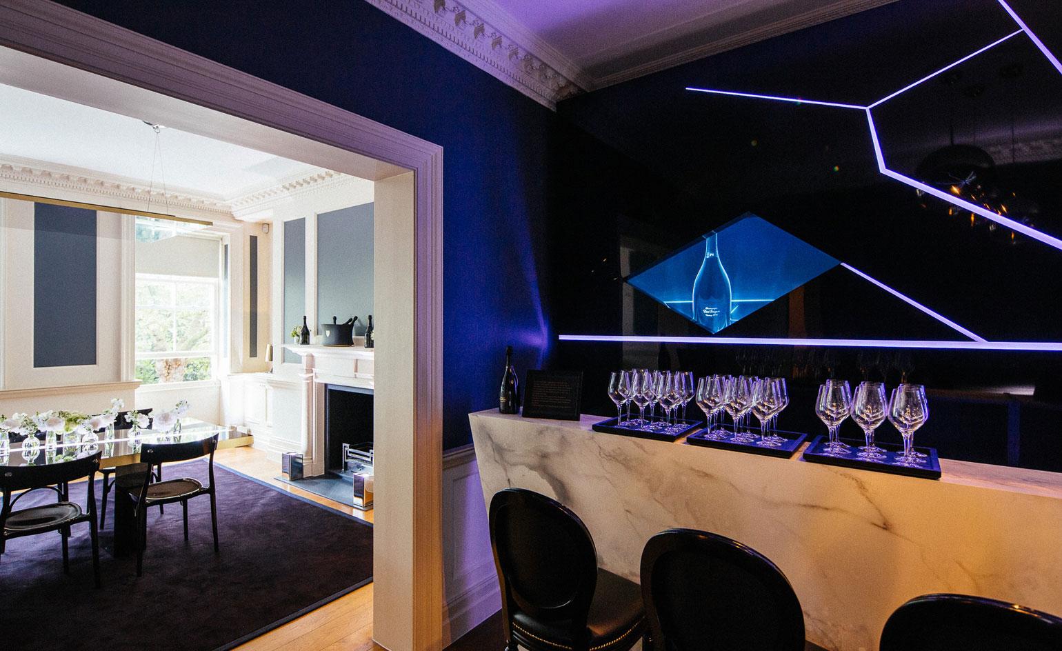 Fendi Casaand Paris-based architect Thierry Lemaire, are plush; a progression of mushroom tones and petrol blues, accented by marble, gold and brass details. This provides a decidedly chic background for the casual fluorescent signage, which lends the space a playful edge, embodying the very essence of one of the most prestigious Champagne brands in the world.
