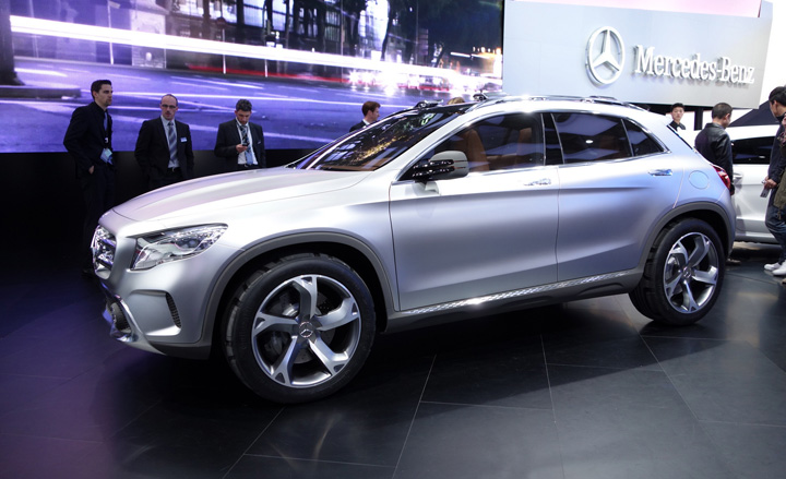 Mercedes Concept GLA: The Concept GLA previews Mercedes' answer to the Range Rover Evoque and Audi Q3, available in Spring 2014. The concept's bold but elegant form is due to become a production reality that will be almost untouched on the outside, as its British exterior designer, Mark Fetherston explains: 'The production car is almost one-to-one to this concept, you won't notice the difference.' Refreshing news then, but don't expect its more futuristic cabin with exposed aluminium structures and thick saddle leather to be tick-box options in a year's time