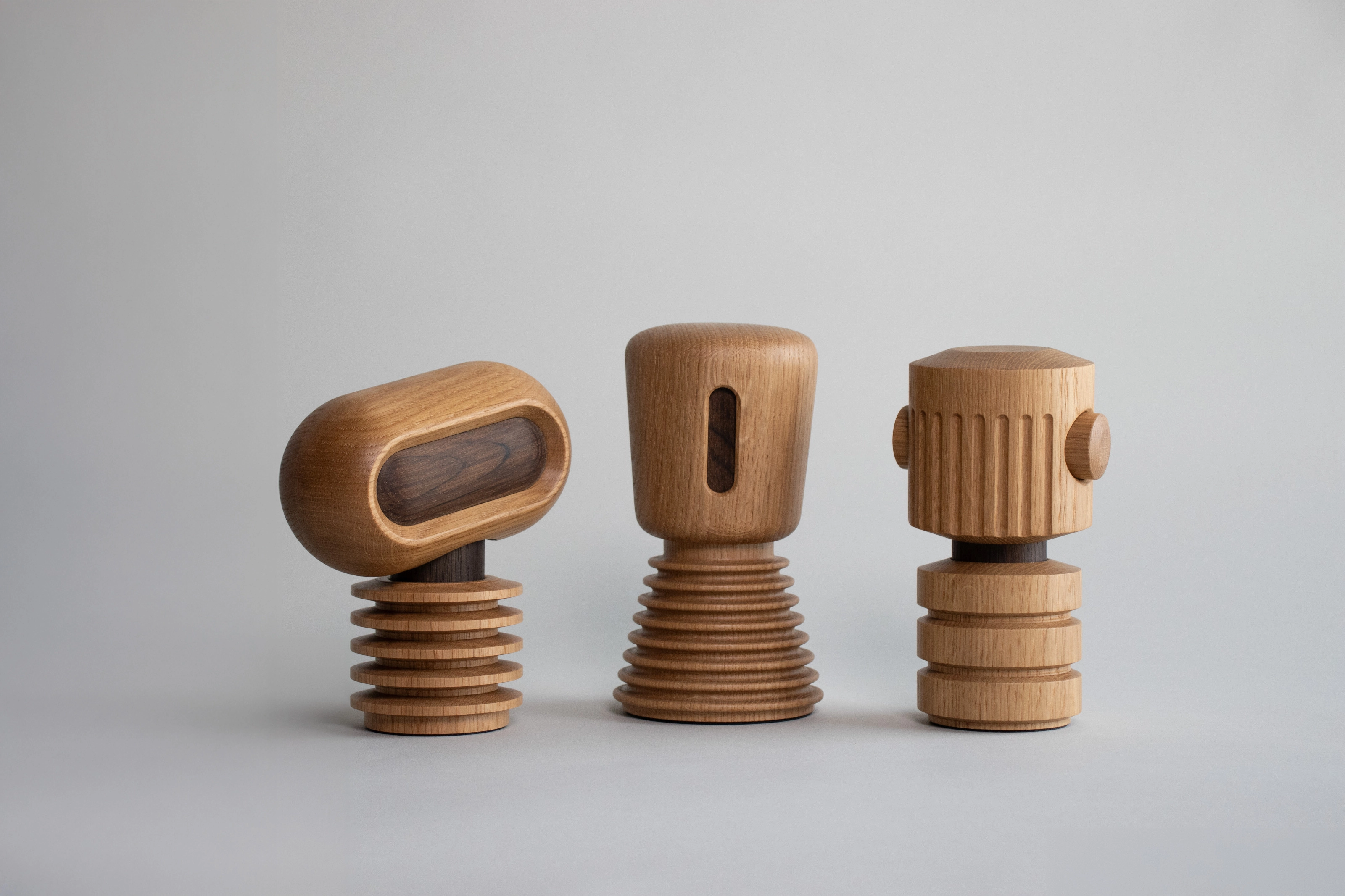 The three are compact (153mm for Beamer, 164 mm for Bot, and 170mm for Hover), designed to slot into shelves of ornaments or among desktop devices. With their soaped and smoked oak finish, Swift Creatives describe the bots as a blend of ‘Danish design tradition with embedded sensors and software’.