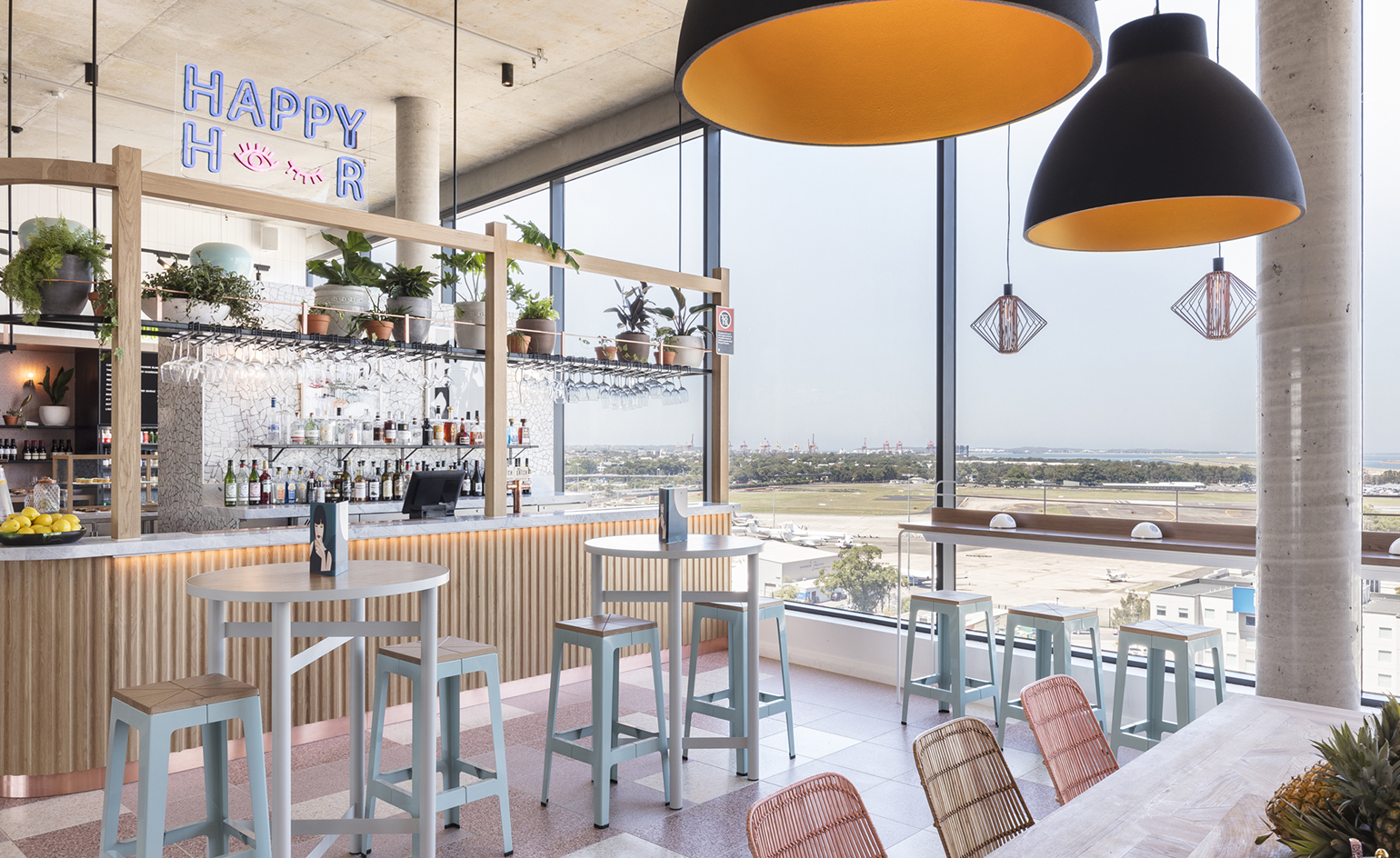 Far from being a standard airport hotel, the 150-room Felix in Sydney raises the bar for layovers and transits with a light-hearted design, by local studios Fox Johnson and Space Control, that takes it cues from the 1960s golden era of air travel.