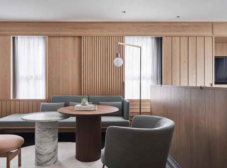 The latest venture from Harry Handelsman of Manhattan Loft Corporation, The Stratford is located in east London’s Queen Elizabeth Olympic Park, inside a SOM-designed, 42-storey double-cantilevered building. Space Copenhagen has devised a muted interior palette of rich, tactile materials and clean-lined, softly-curved upholstered shapes that are revealed through a mix of bespoke pieces and furniture by brands like Gubi, Stellar Works and Benchmark. On the ground floor, the triple-height triangular lobby is anchored by a 10m-tall fireplace and a standout installation by designer Paul Cocksedge. The Stratford Brasserie hums from morning to night, and there is also Allegra, headed up by Patrick Powell, formerly of Chiltern Firehouse.