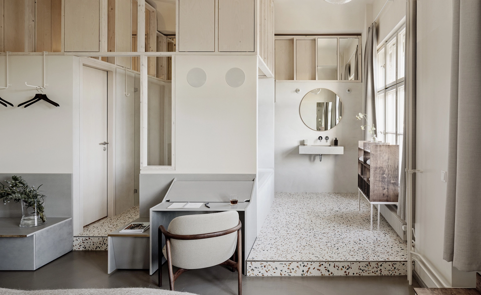 Quirky touches abound, not least the odd placements of mirrors that create the illusion of other rooms, alongside slanted writing desks, slender benches and chairs made from Panzerholz – a compressed plywood that has a pleasing weathered, almost velvety veneer and which, oddly enough, is also bullet-proof. Both the beds and bathtubs are enclosed in floor-to-ceiling cutaway cabinets, their imposing bulk inspired by a railway signal box outside the hotel.