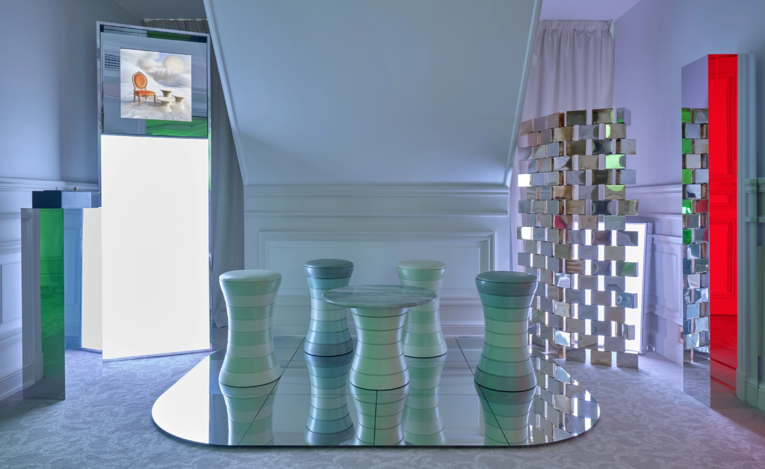 Suite 1835 unfolds across three rooms: a living room, a bedroom, and a yoga and meditation space. Each is arranged as a stage for sound, light, and image, creating a universe that heightens the senses. The meditation room features a rotating mirrored cube displaying digital work generated by AI.