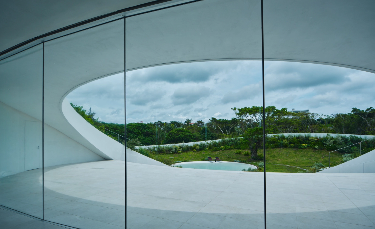 Located on the subtropical shores of Ishigaki Island, in Japan’s southernmost Okinawa region, Not A Hotel Earth is a private villa designed in the form of a tilted, plant-wrapped circle, overlooking the East China Sea. White, light and purist, with a hint of futurism, the seemingly wall-less structure hovers weightlessly in its setting. Infinity pools and glass walls create near-invisible boundaries between inside and out, while at its curved heart lies a wild meadow.