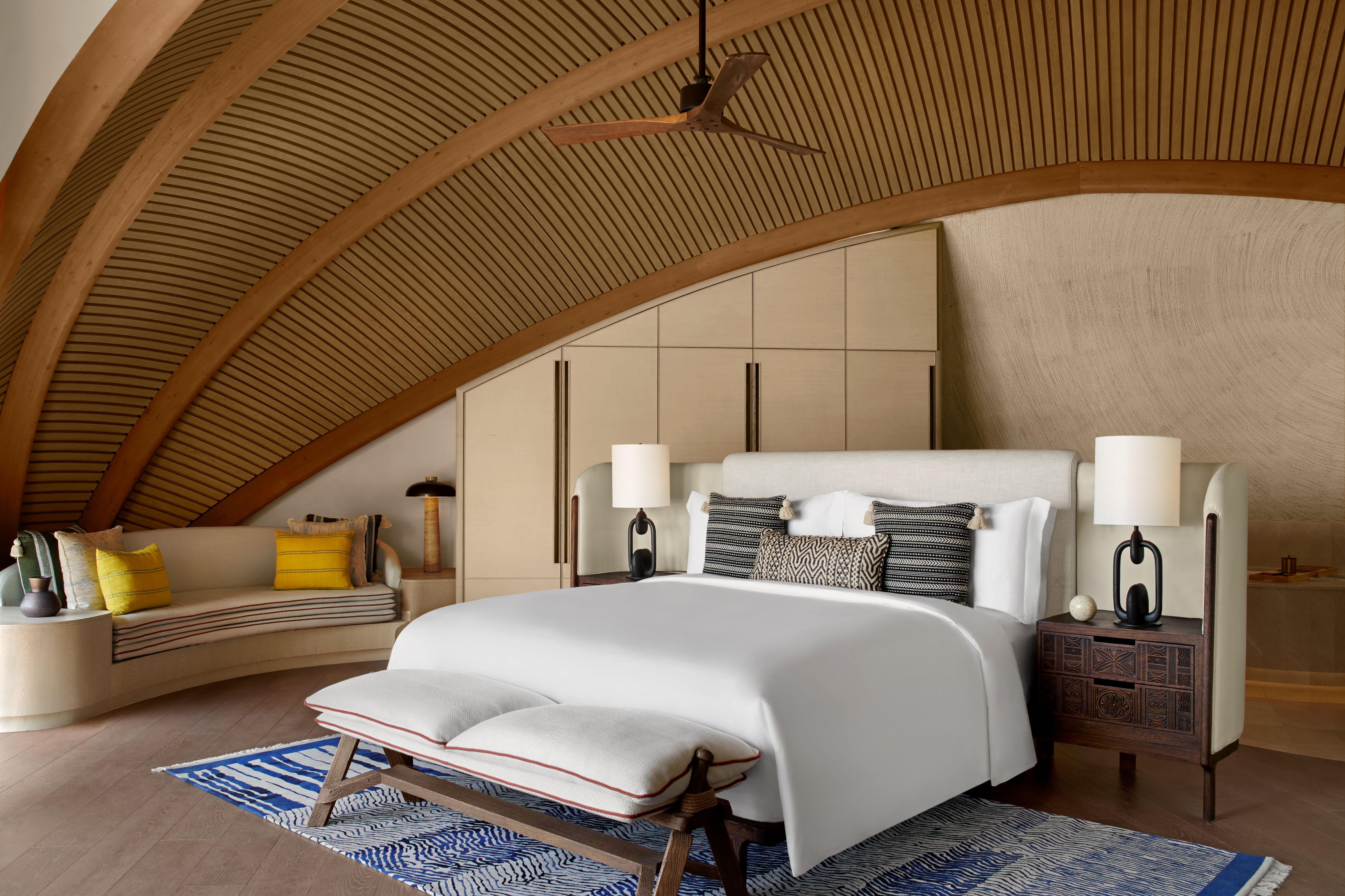 The resort itself is a beauty to look at, its design – the work of British firm Foster + Partners – featuring clean lines, sandy hues and graceful curves that blend seamlessly into its desert and coastal environment. Each of the 63 villas and the cluster of public spaces on the main island are housed in a sweep of dome-like pods, their curved exteriors, which are bound by textural rope, inspired by the rounded shape of a closed mussel shell. Inside, ribbed arched ceilings serve as a dramatic framework for a layout that includes a spacious living room and dining area, a walk-in mini-bar as well as a bedroom that has been smartly designed to feature amenities, such as the freestanding bath, the wardrobes and the built-in seating to cocoon the central bed, which looks out onto a sprawling terrace, private pool and the azure seas beyond.