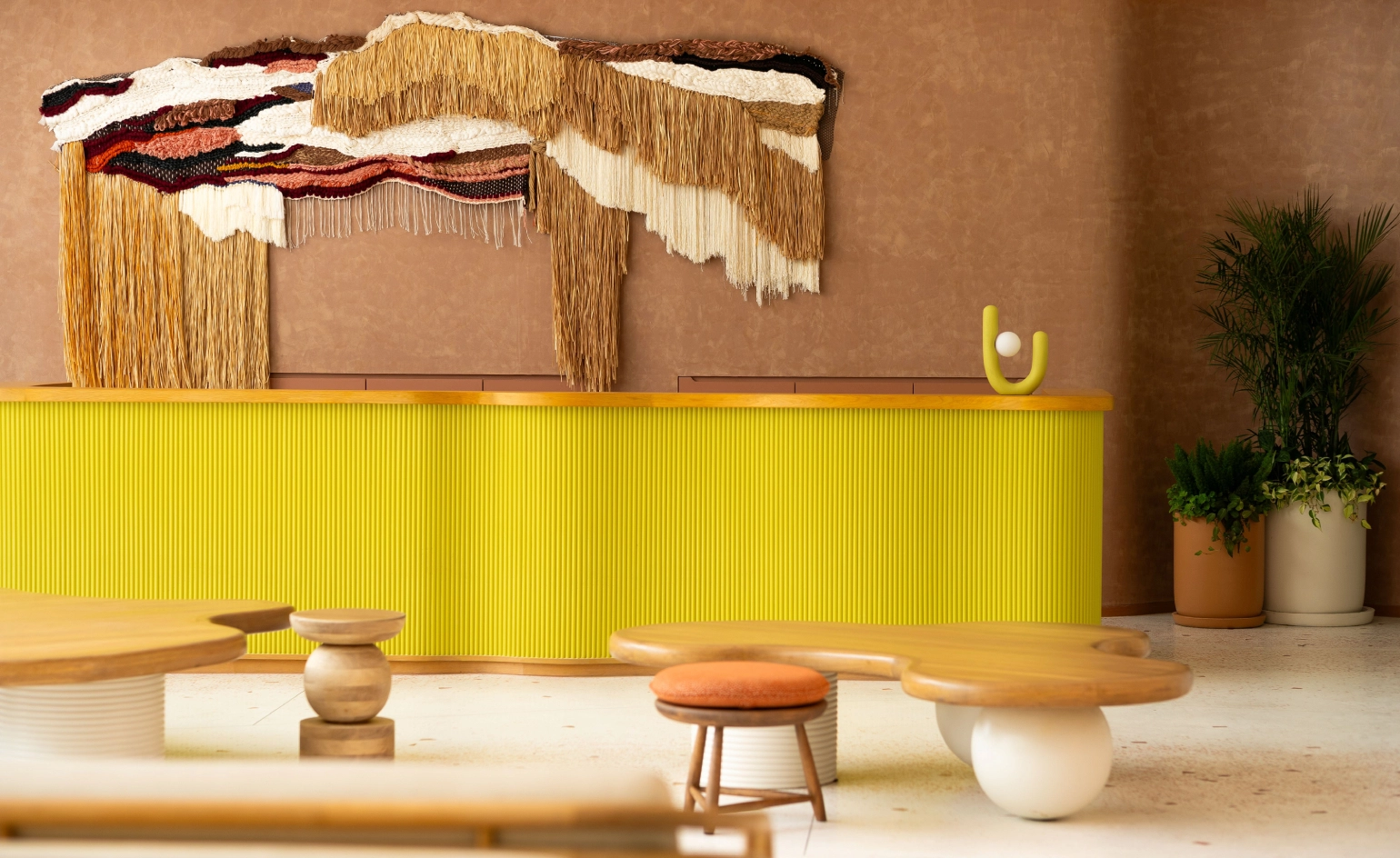 On arrival, guests encounter colourful art installations that contrast with the structure’s bright backdrop. Both the main and the VIP reception desks are backed by wide tapestries created by Yarn Studio, richly textured and in local tones, while the two abstract figures of French artist Chloé Kelly Miller’s Unity of the Double sculpture provide a welcome in the first courtyard. Interior design is conceived by Din Studio, its third collaboration with The Standard’s Thai outposts. From sleek furnishings to quirky light fittings, in the shape of lips, for example, and playful murals, the studio has adopted natural tones with occasional pops of bolshy colour. Perhaps most memorable on the design front are the staff uniforms by Vickteerut, a Bangkok fashion house under the creative direction of Aurapraphan ‘Pang’ Sudhinaraset, designed for ease in upbeat colours.