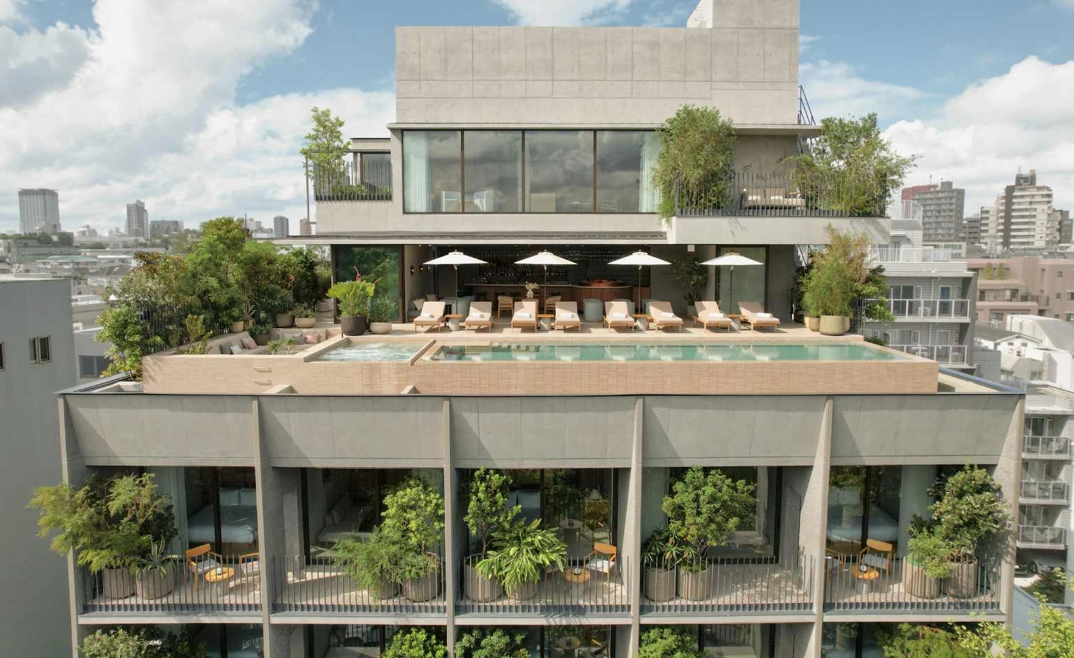 Rising seven storeys, Trunk(Hotel) Yoyogi Park is a new-build shaped by a measured collaboration between Tokyo-based Keiji Ashizawa Design and Copenhagen’s Norm Architects. The pairing is a natural one: Japanese restraint tempered by Nordic calm, executed with an emphasis on tactility. It all begins on the exterior: a textured façade of roughly hewn aggregate concrete, softened by balconies thick with wild planting. The effect mirrors the treetops across the street.