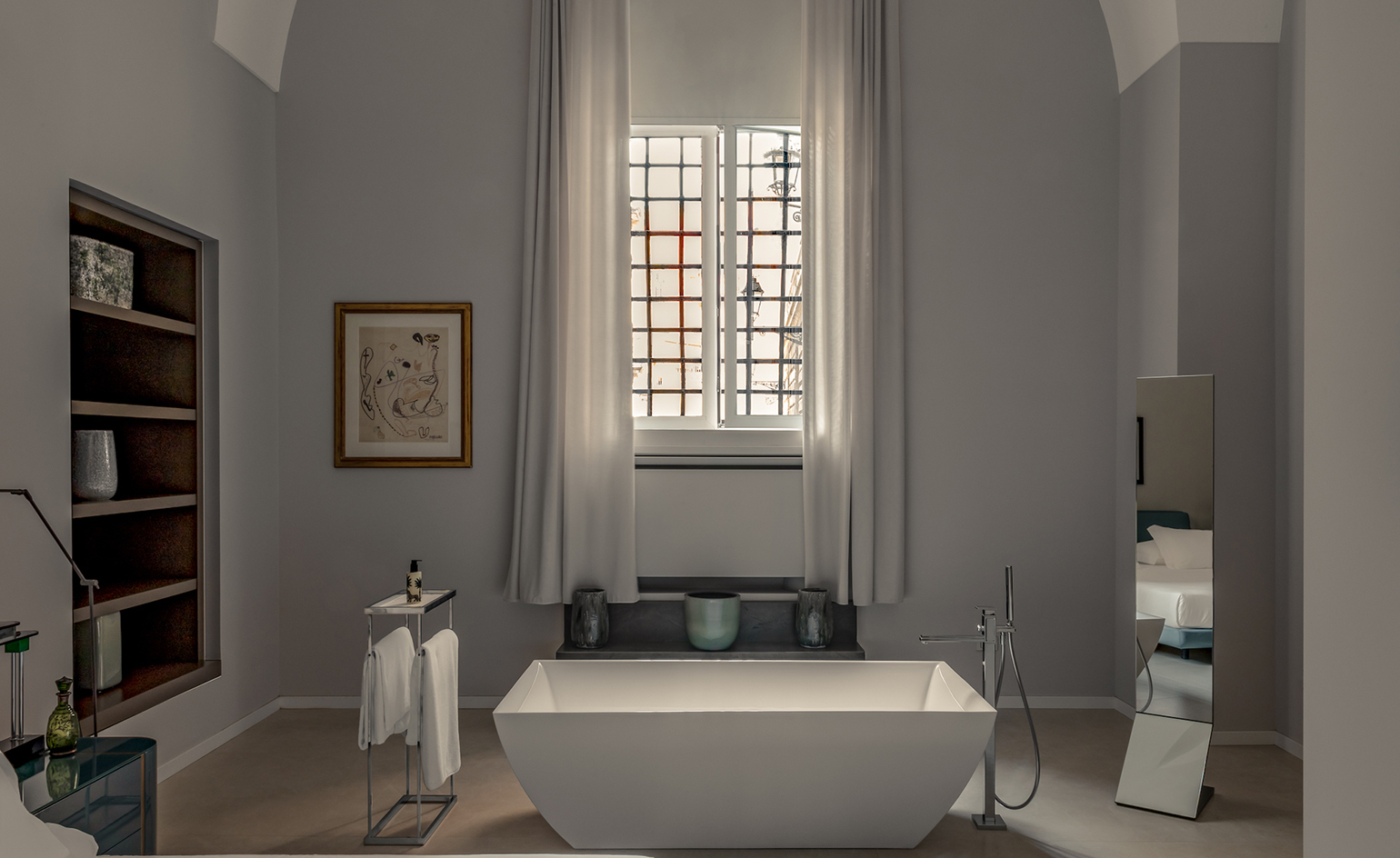 Wisely, French studio Laboratoire Design Rabat have worked light touches on the aristocratic bones of the 1775 baroque palazzo to carve out ten large suites, whose original high ceilings and light-filled volumes are contrasted by long creamy drapes, Le Corbusier Escargots lamps, and classic furniture by Gio Ponti and Ettore Sottsass.