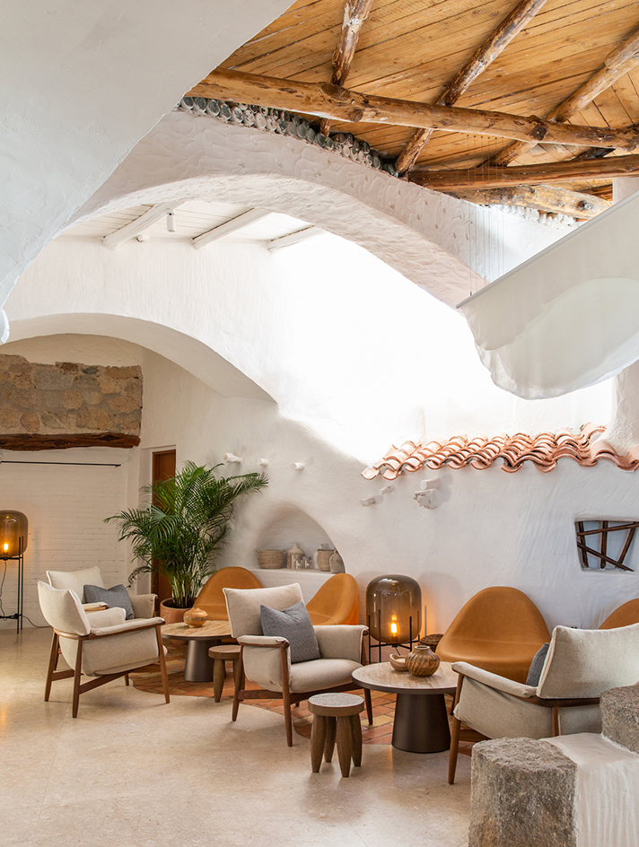 The brief may have been the classically vague ‘contemporary luxury’, but the result is a lighthearted, yet slick, take on a rustic fisherman’s adobe where a roof of roughly hewn bleached logs and planks rests on sinuous white washed walls, terracotta tiles, raw stone surfaces, and rattan pendant lamps. Very cleverly, Blacksheep diffuses the harshness of the exterior light into the space through recessed wall-wells.