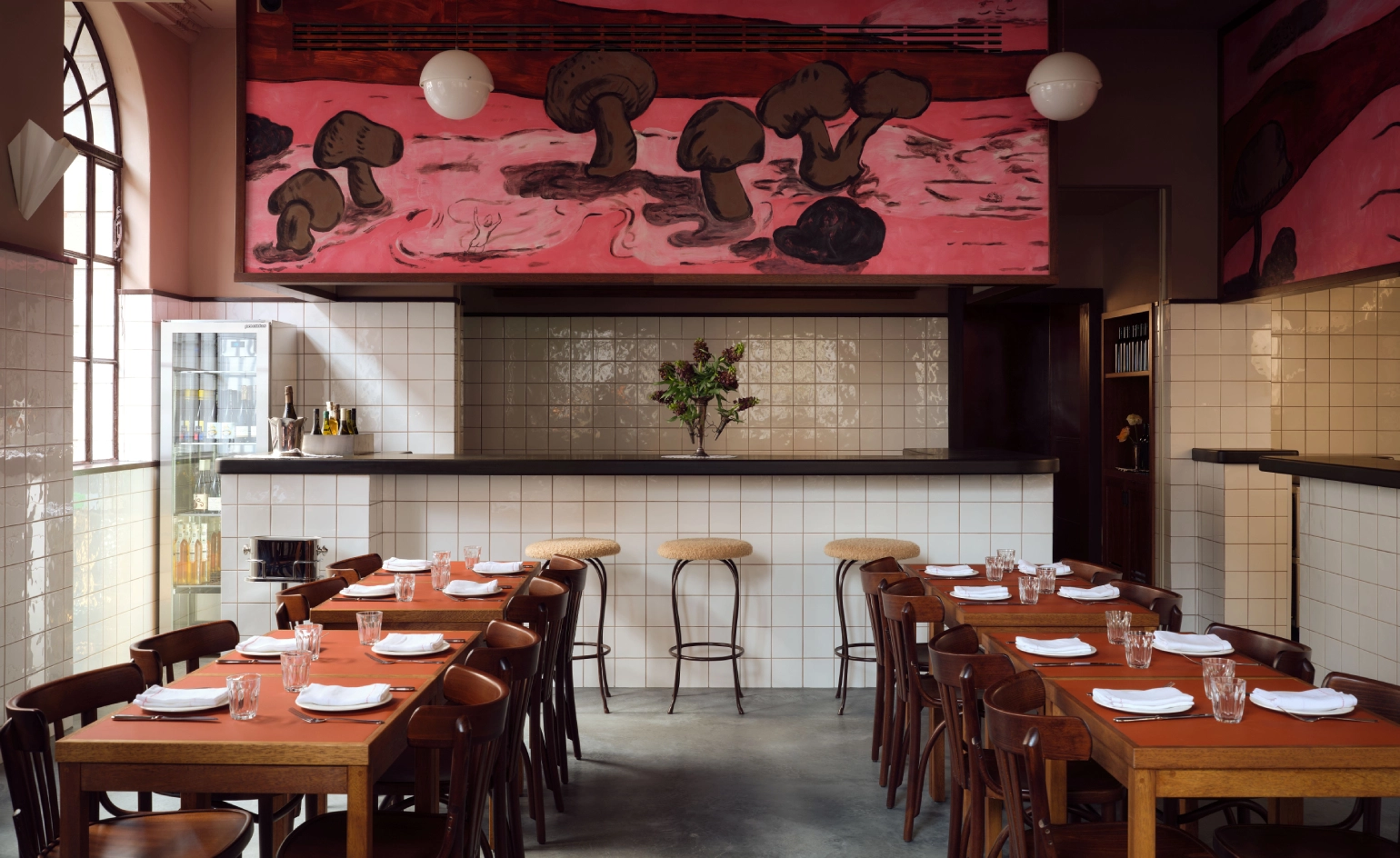 The snug room unfolds in a stripped-back palette of natural tiles, steel, linoleum and canvas, offset by a hand-painted mural in deep pinks. Figures and oversized vegetables emerge across the walls: a surreal ode to soil, sustenance and regeneration, where body and earth blur into one.