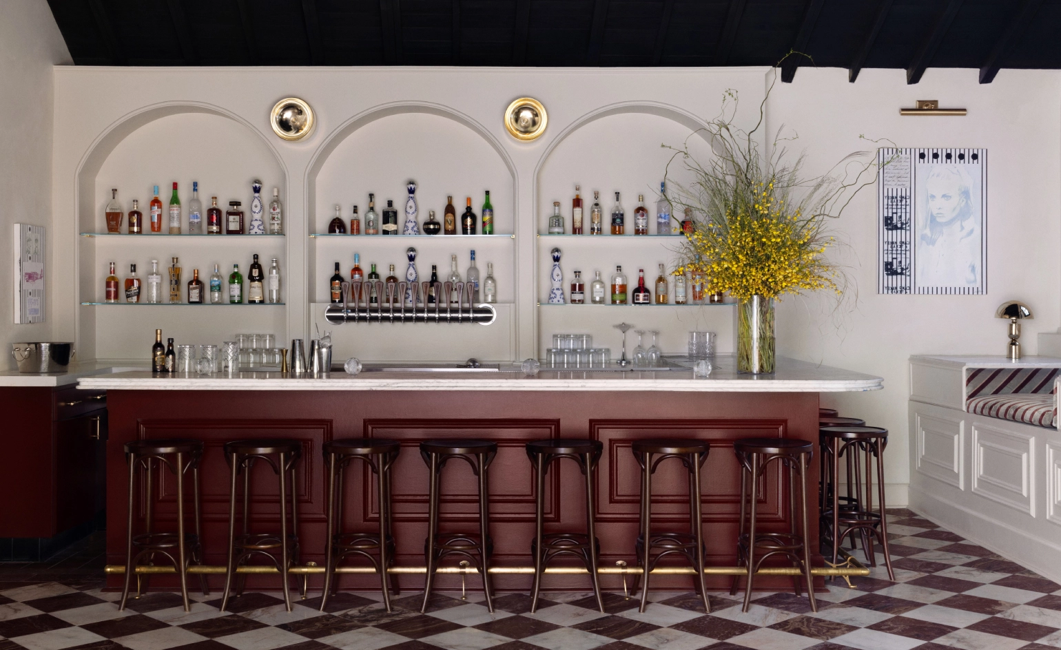 Describe the mood: Designed by London and New York-based Martin Brudnizki Design Studio, expect a maximalist décor in an intimate space that blends the Riviera with Hollywood Regency. From the black and white historical photos and mirrored ceilings, to cosy plush jewel-toned booths and a backlit marble bar, it has the air of a private club.