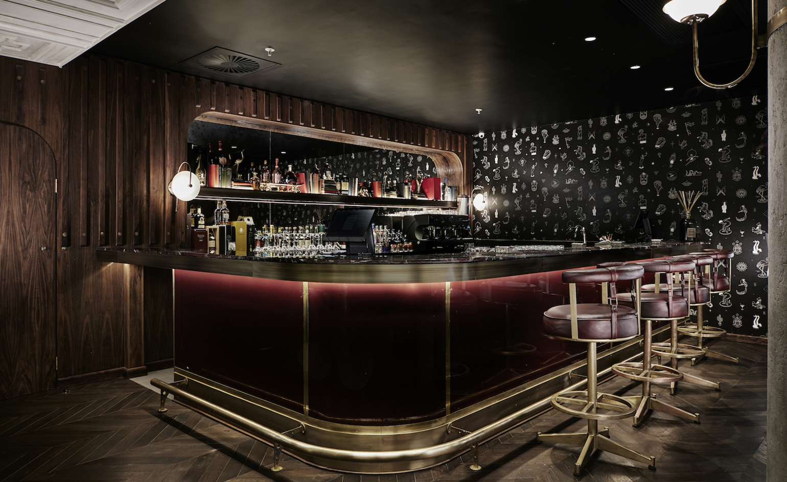 Local designer Tristan Plessis Studio has unraveled the subterranean labyrinth of varying volumes to create a series of dramatic room-sets, including three bars and dining rooms. The entrance sets the tone with a bijou corridor topped by a ceiling carved from a solid piece of hand-moulded polished stainless steel to look like liquid mercury; whilst creamy wall panels curve, Inception-like, up and over plush, crescent shaped banquettes.
