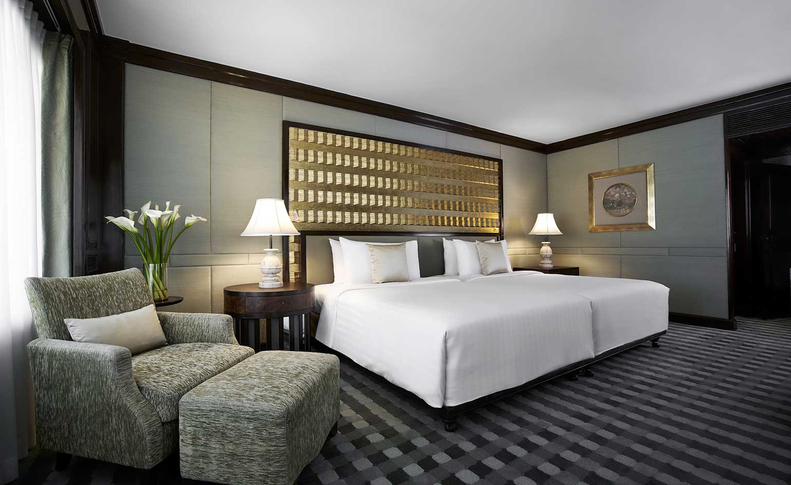 As such, silk wall panels, leather headboards and traditional furnishings are pulled together by modern grey and royal blue colour palettes, while glass bathroom doors are etched with pencil sketches of the birdlife that can be seen in nearby Lumphini Park.