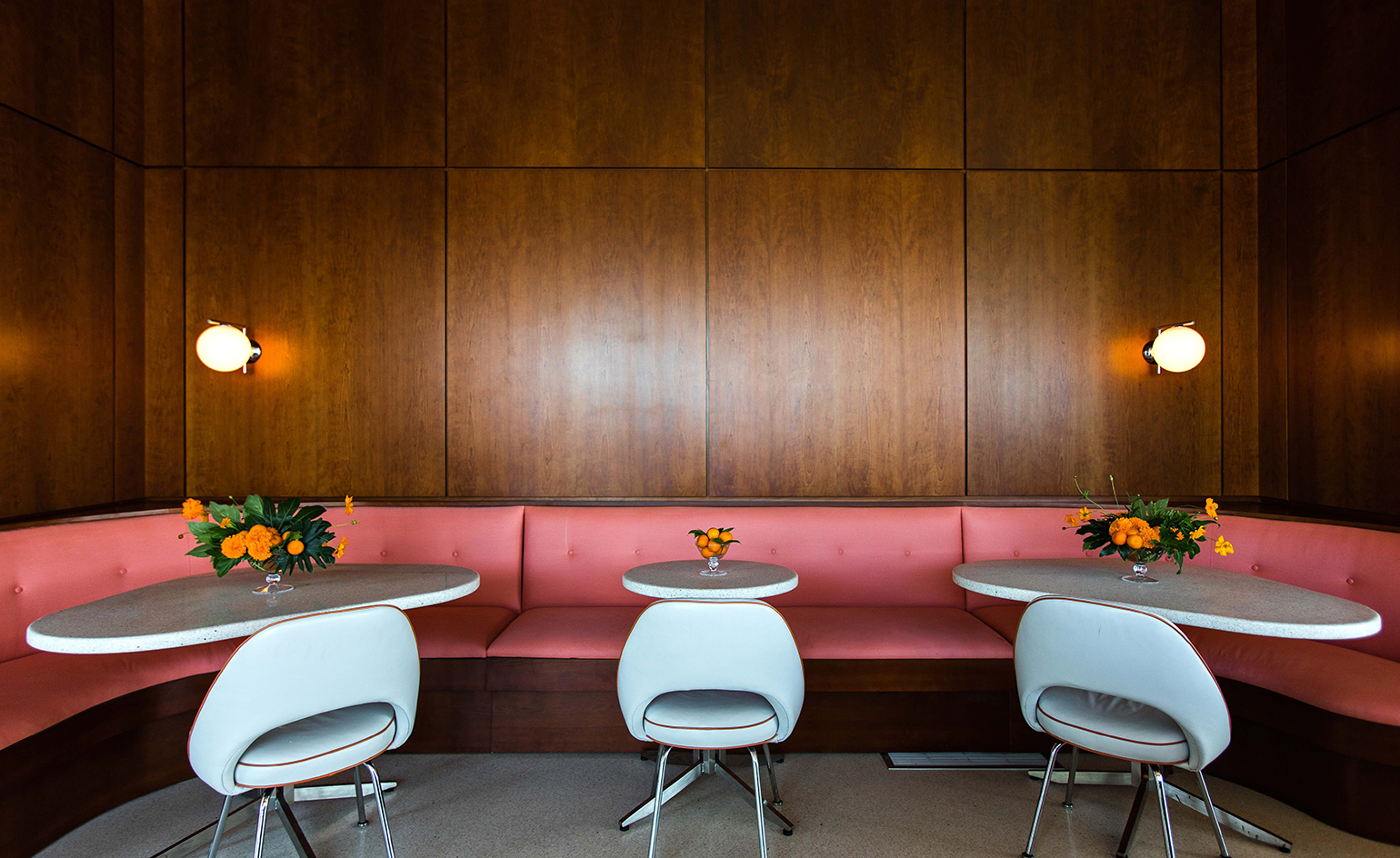The eighth-floor rooftop hangout (the highest in town), designed in partnership with Workstead, the very agency that oversaw the interiors of the hotel, features the same opulent but relaxed modernist style of the property. The indoor restaurant’s bespoke melon leather banquettes, custom terrazzo-wrapped bar, and sculptural four-legged stools provide the mid-century visual foundation. While colourful citrus plants and neon signs of navel orange slices that were hand-drawn by the founder John Dewberry himself inject the space with plenty of whimsical flourishes. But looking out pays off, too: From the terrace, you can see as far as the Atlantic Ocean on a clear day.