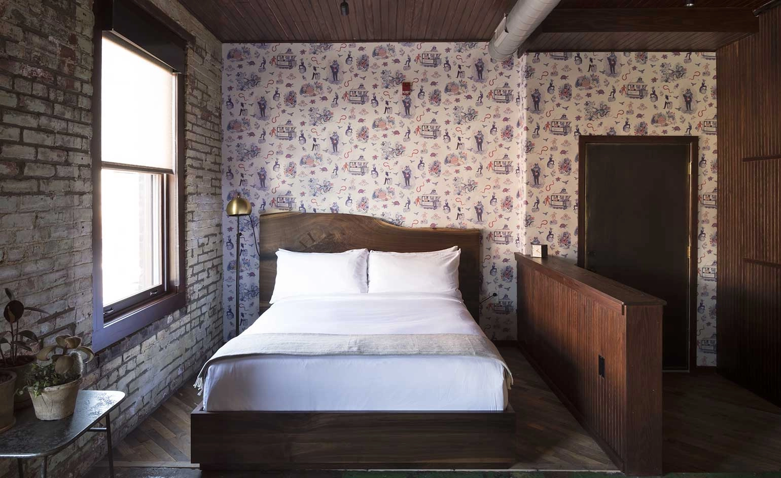 The hotel’s muted colour palette, rich wood finishings and decorative wallpaper by Stacey Rozich may all hark back to the its historical roots, but custom-made wood furniture by Tim Lewis Studio and industrial lighting pieces from Roll & Hill and Workstead serve as crisp, contemporary counterpoints. Vintage rugs underfoot and a plethora of plants and cacti also bring a warm, lived-in feel. A second restaurant on the ground floor is still to come.