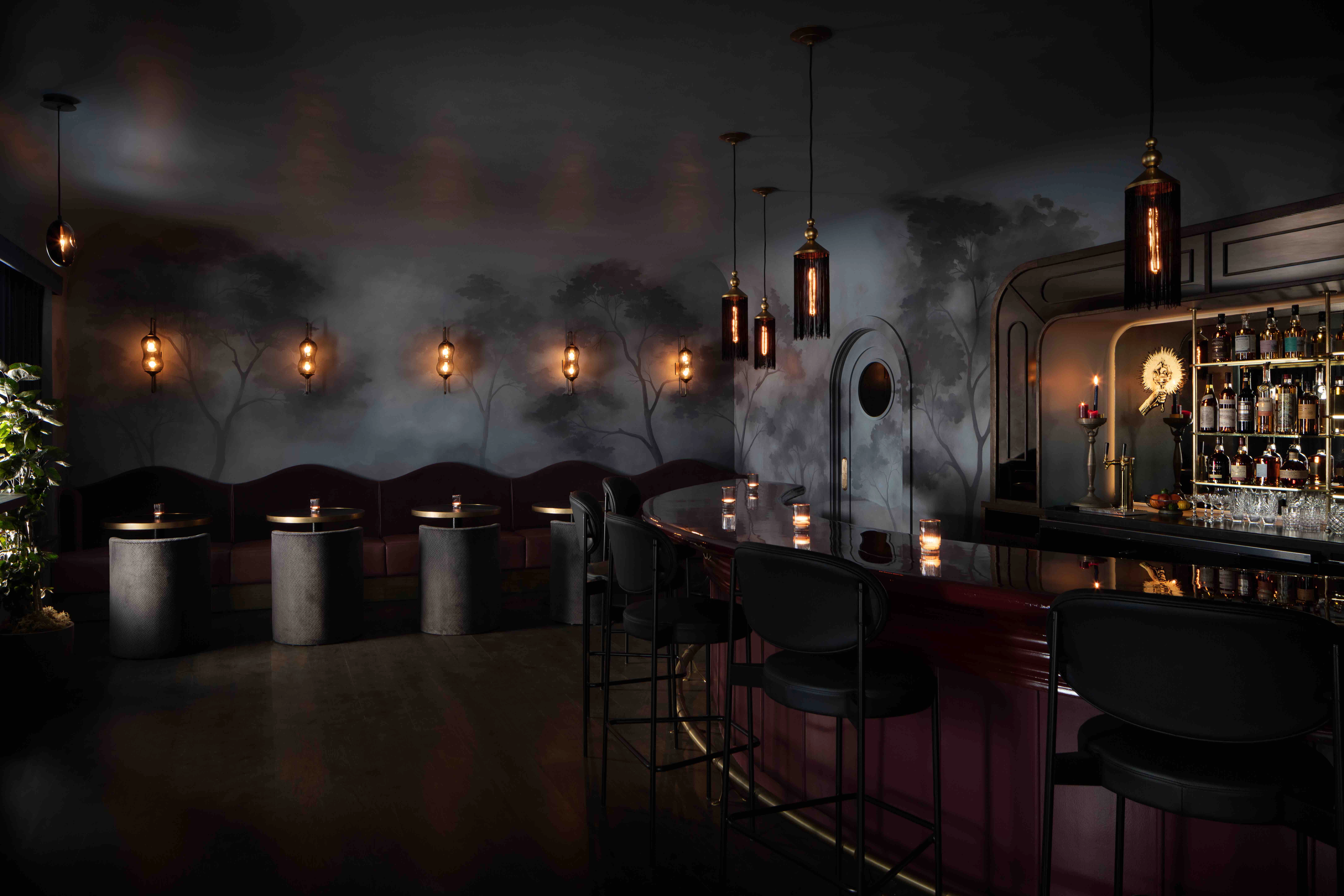 When service can be resumed on-site, visitors will be able to kick back in the space’s upstairs lounge, The Outpost, which combines ocean blue Craftsman-style wainscoting with custom-designed coffee tables by Studio Becky Carter and personalised vintage touches. A discreet hallway leading to a pocket door also leads to The Beacon, a glamorous, speakeasy-style cocktail bar that’s adorned with mural walls, painted by artist Caroline Lizarraga, and a blood red lacquered bar.