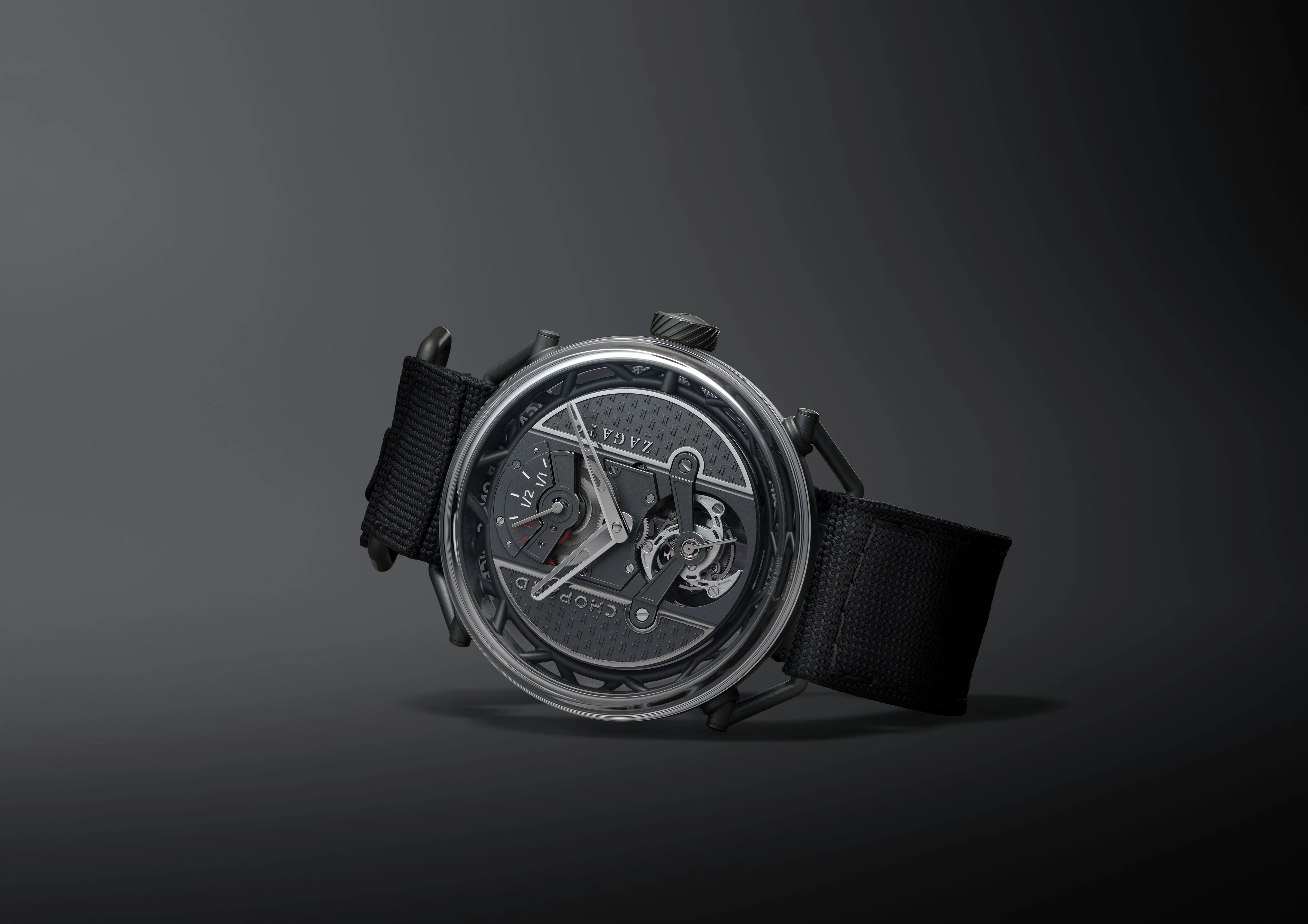 Lab One is less about conventional ergonomics and more about a dynamic balance that sets a new skeletal tone, and a logic that continues inward. The movement, Chopard’s L.U.C 04.04-L, is not hidden but suspended, its bridges and mainplate rendered in ceramicised titanium and exposed as the dial surface, which itself adopts a stealth-like engine vibe. The familiar hierarchy of dial, hands and case is exposed in its micro-architectural parts, where structure becomes visible and integral to what Zagato would classify as the engine, the L.U.C 04.04-L movement. Zagato’s recurring “Z” motif is milled directly into the surface, with its monochrome geometry resembling the surface of a contemporary industrial building.